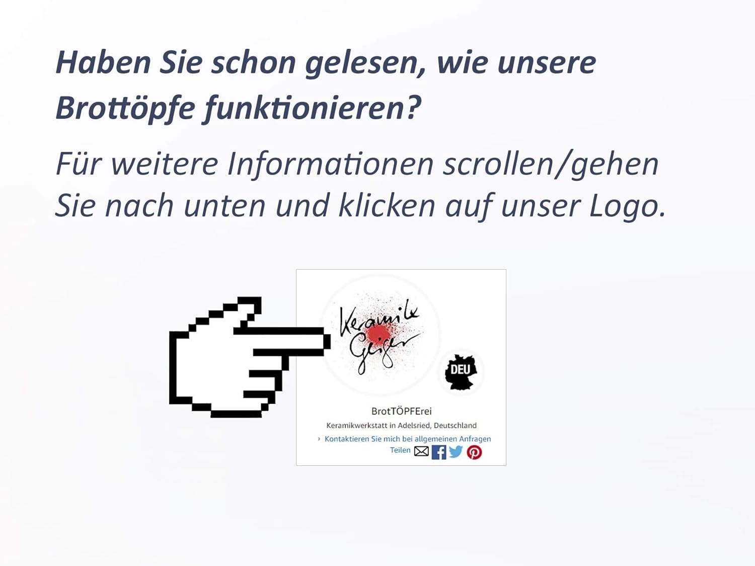 Runde Brote passen bis zu 1½ kg in diese Grösse, auch die selteneren 2 kg Brote meist noch. Beim Kastenbrot für 750g oder 1 kg (normalerweise die gleiche Form) bleibt noch Luft. Ovale 1 kg-Brote finden Platz, wenn einige Scheiben abgeschnitten sind. Diese Grösse hat sich für die meisten Familien und oft auch für Paare bewährt. Materialien: Gefäss: 1300°C-Steinzeug mit Feldspatglasur (hoch-widerstandsfähig und abschlagsicher) Deckel: atmungsaktives, unbehandeltes Dreischicht-Fichtenholz, 13 mm (wichtig für den Feuchtigkeitsdurchgang), stossunempfindlich (jeden Tag sehr angenehm) Masse Nutzvolumen ca. 8 l Aussen-Ø ca. 32 cm, Innen-Ø an der engsten Stelle oben ca. 28 cm, Innen-Ø weiter unten ca. 30 cm, Höhe aussen ohne Griff ca. 14 cm, mit Griff ca. 19 cm, Nutzhöhe innen ca. 12 cm, Gewicht ca. 4 kg Pflege: Normalerweise genügt es, die älteren Brösel trocken auszuwischen. In unseren Töpfen herrscht optimales Klima, trotzdem hält sich Brot natürlich auch darin nicht unbegrenzt. Sollte doch einmal Brot schimmeln, waschen Sie den Topf mit Essigessenz (pur) aus und verteilen diese auch flächendeckend satt auf der Deckelunterseite. Lassen Sie’s einsaugen und in der Sonne trocknen, so verfliegt der Geruch schnell. Damit wird eventueller Schimmelpilz zuverlässig beseitigt. Der Brottopf ist, wie all unsere Keramik, absolut spülmaschinenfest, der Holzdeckel nicht.