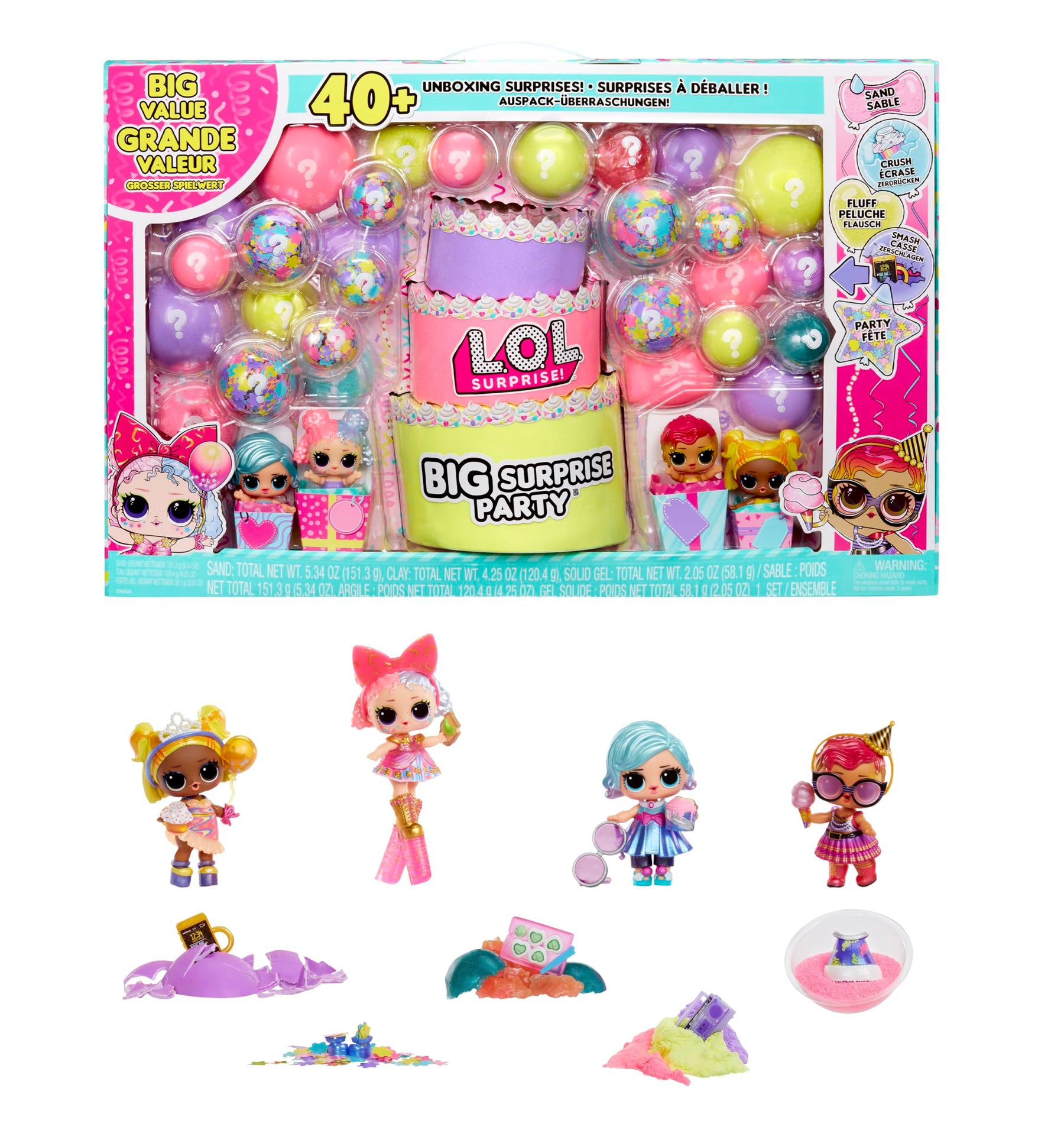 - 5 Methoden ZUM AUSPACKEN: Zerschlage die dünne Muschelkugel und zerquetsche die L.O.L.-Gelkugeln, um Überraschungen zu entdecken. Wühle dich durch den Sand, den Flaum und das Party-Konfetti, um weitere Überraschungen und Talismane zu finden