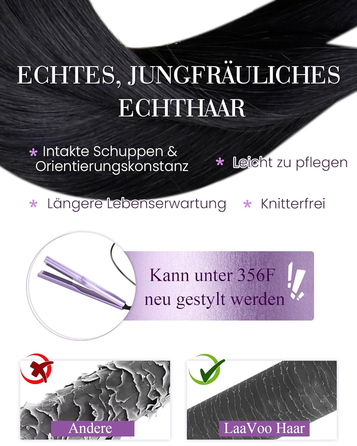 - 2. Langlebig: Die geklebten Enden bestehen aus gute Qualität italienischem Keratin-Kleber, der sowohl weich als auch klebrig am Haar ist, heissschmelzend und langlebig zu installieren ist. Spezielle Lösungsmittel ermöglichen das einfache Entfernen von