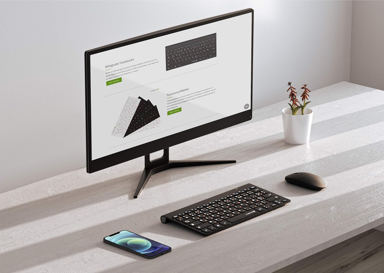 - Zweifarbige deutsch-russische Tasturbelegung (erleichtert das Unterscheiden der deutschen und russischen Buchstaben), angepasst auch für ukrainische Sprache