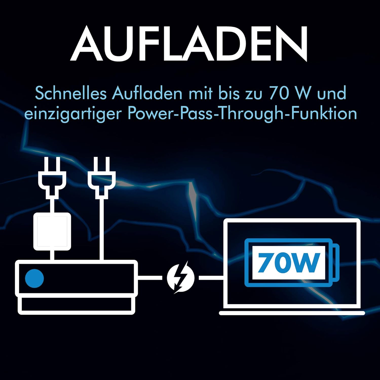 - Laden Sie einen USB-C-Mac oder einen anderen Laptop mit bis zu 45 W über Thunderbolt 3 (bis zu 30 W bei Reihenschaltung anderer Geräte) auf oder über Power-Pass-Through sogar mit bis zu 85 W bei Verwendung des Laptop-Netzteils
