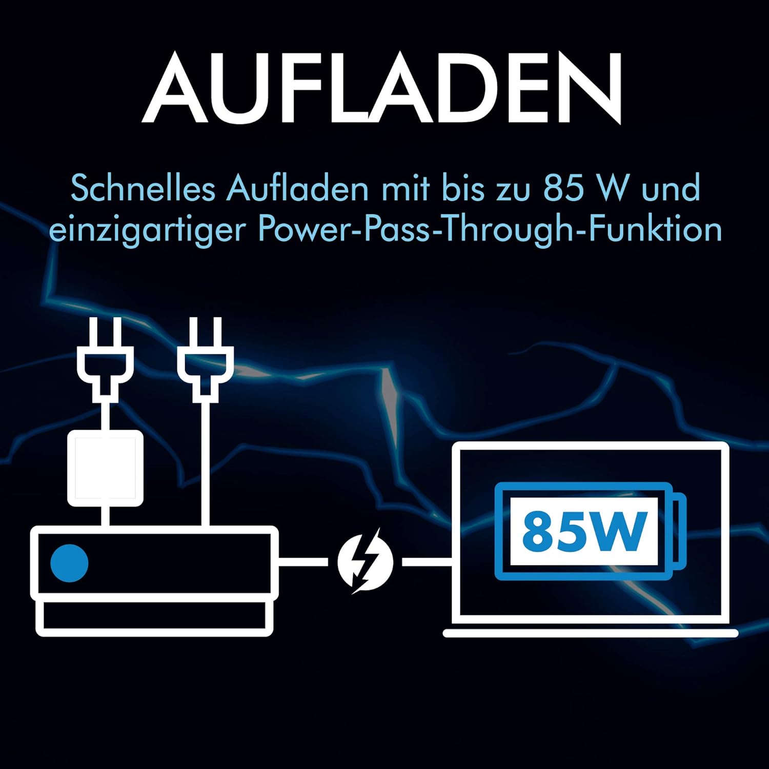 - Laden Sie einen Mac oder einen anderen Laptop mit bis zu 45 W über Thunderbolt 3 (bis zu 30 W bei Reihenschaltung anderer Geräte) auf oder über Power-Pass-Through sogar mit bis zu 85 W bei Verwendung des Laptop-Netzteils