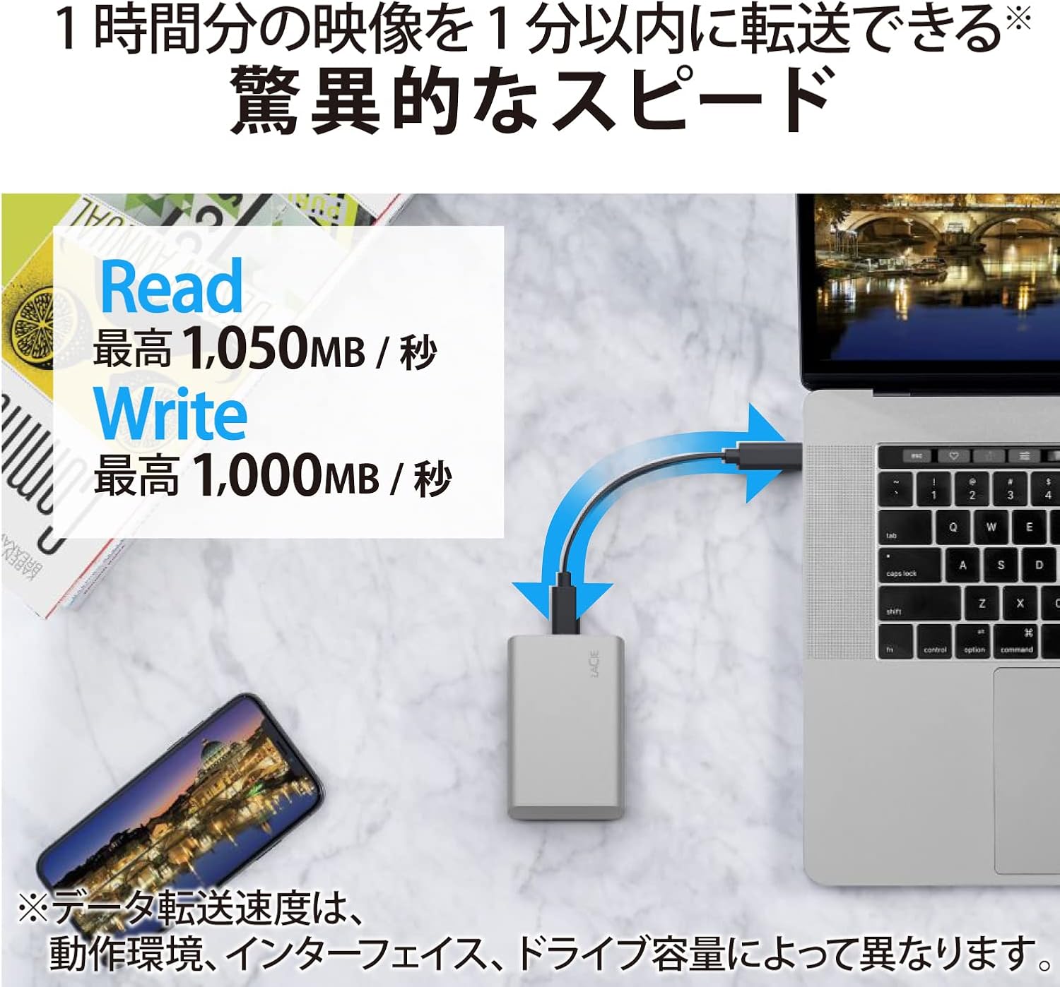 - Seien Sie produktiver und gönnen Sie sich dank LaCie Mobile SSD Secure mit passwortbasierter Hardware-Verschlüsselung eine Auszeit. Schnelle Dateiübertragungen mit Lese- und Schreibgeschwindigkeiten von bis zu 1.050 MB/s bzw. 1.000 MB/s. Einfache