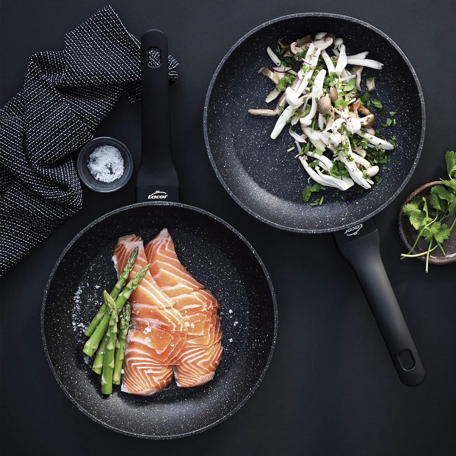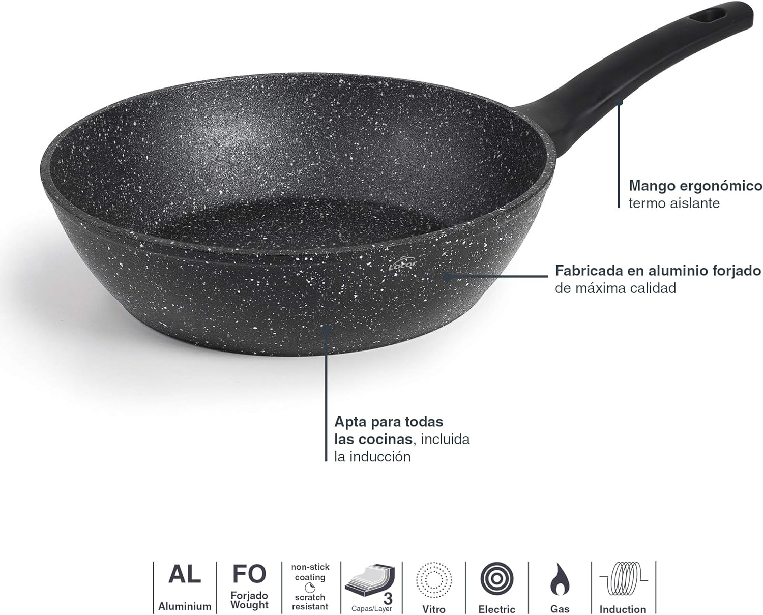 - Schmiedeeiserne Pfanne aus hochwertigem Aluminium. Dreischichtige Antihaftbeschichtung, verstärkt mit Partikeln auf Steinbasis, frei von giftigen und schweren Materialien. Umweltfreundlich und frei von PFOA.