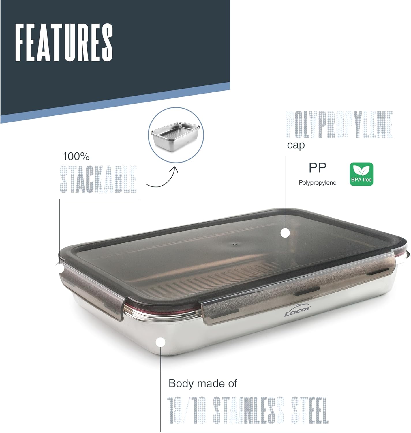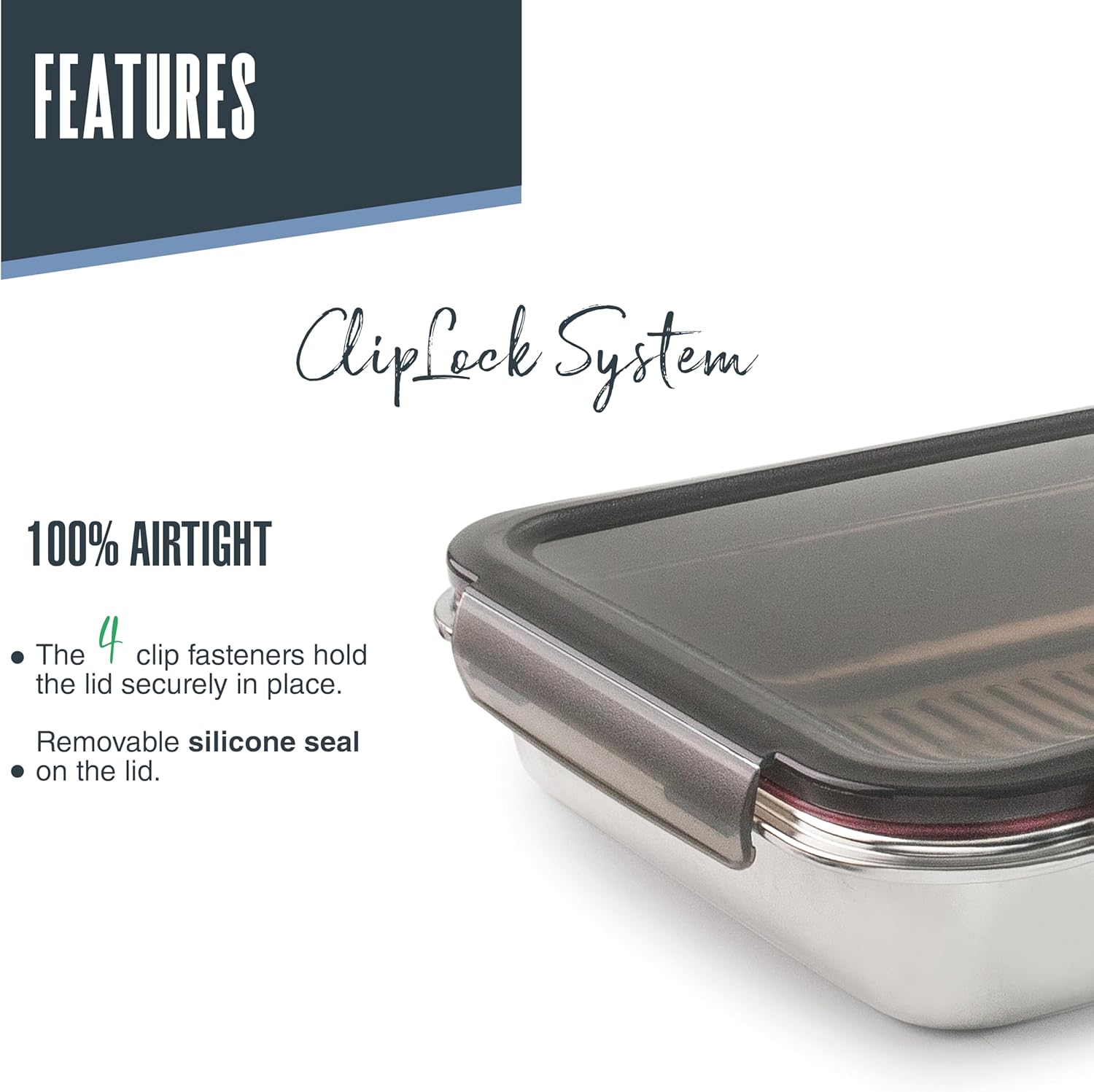 - Luftdichter ClipLock-Verschluss: Polypropylen-Deckel mit vier Schnappverschlüssen und herausnehmbarer Silikondichtung, die eine vollständige Abdichtung gewährleistet, das Auslaufen verhindert und Lebensmittel auch während des Transports oder der
