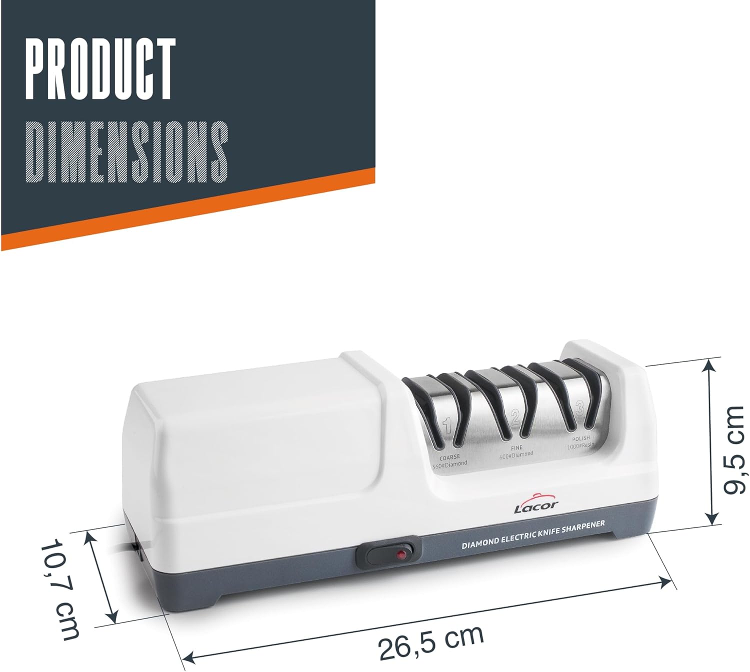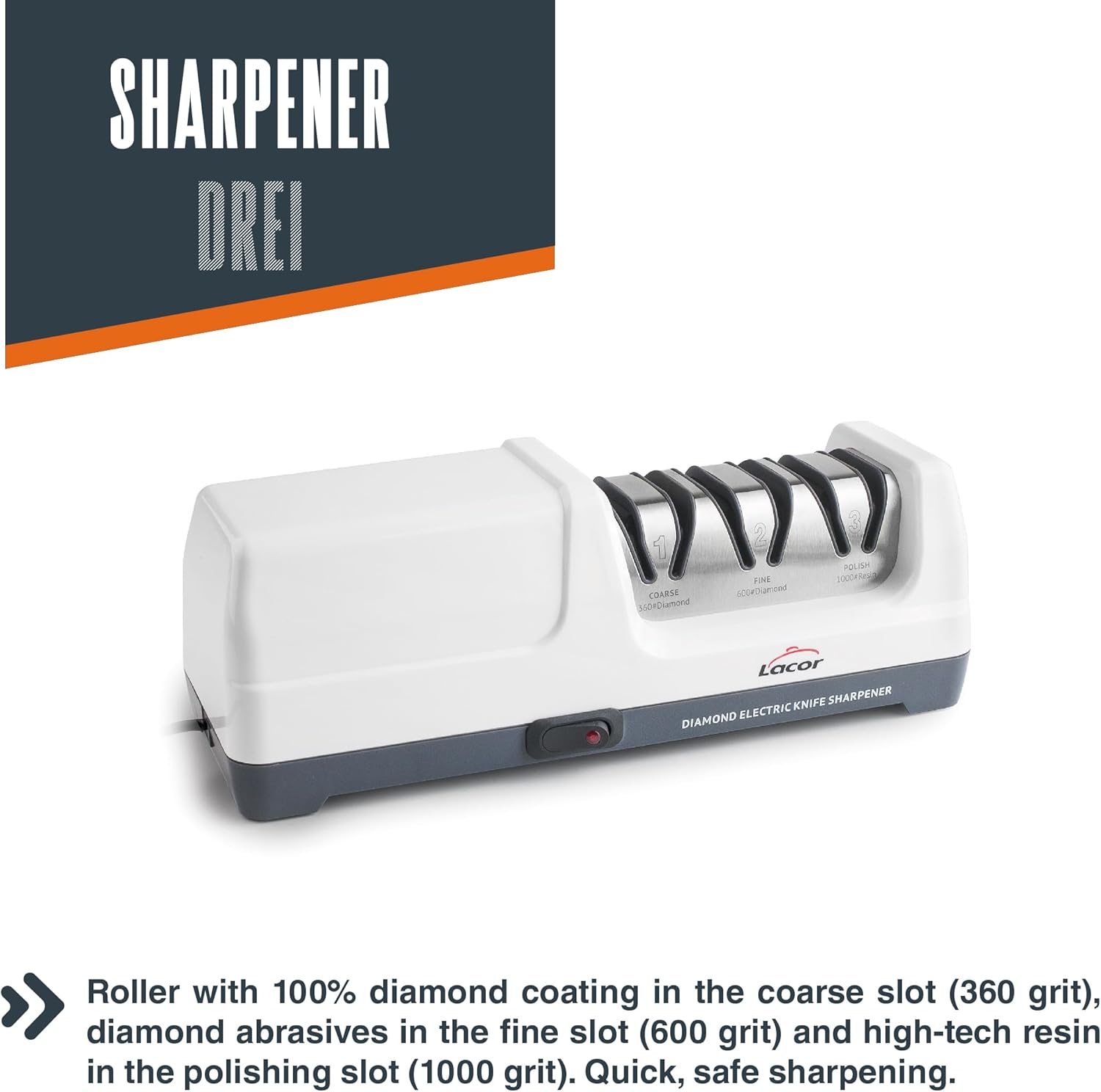 - 3-stufiges Schärfsystem mit einem Winkel von 20: grob (360 Körnung), fein (600 Körnung) und poliert (1000 körnig), das ein schnelles und sicheres Schärfen ermöglicht