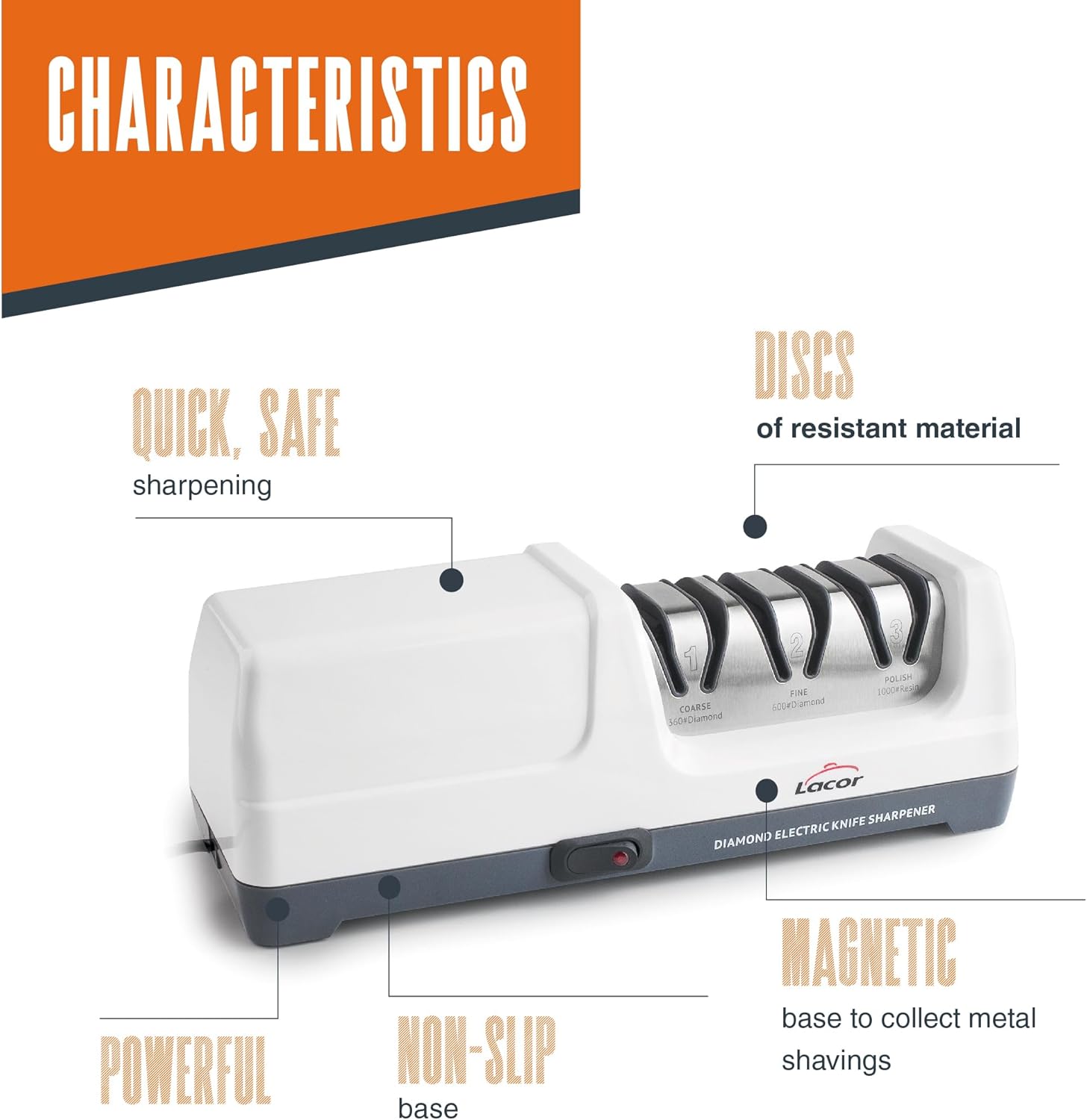 - Elektrischer Messerschärfer mit langlebigen Scheiben, für den intensiven Gebrauch und geeignet für Edelstahl- (glatt und gezahnt) und Keramikmesser
