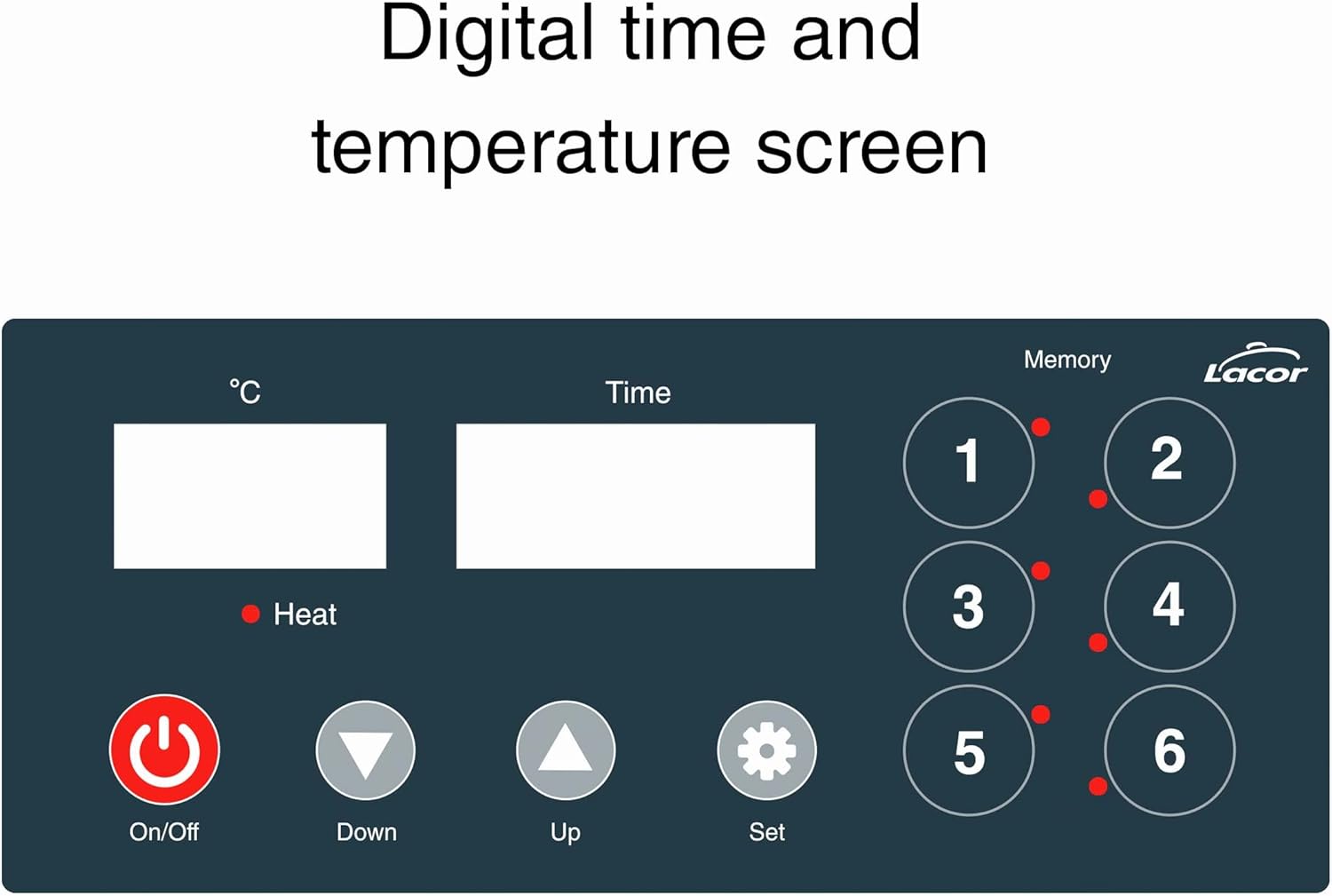 - Digitale Zeit- und Temperaturanzeige mit hochpräzisem Thermostat, einstellbar: 30 °C - 90 °C (0,1 °C) und einstellbarem Timer: 99 Stunden und 6 Speicherplätze.