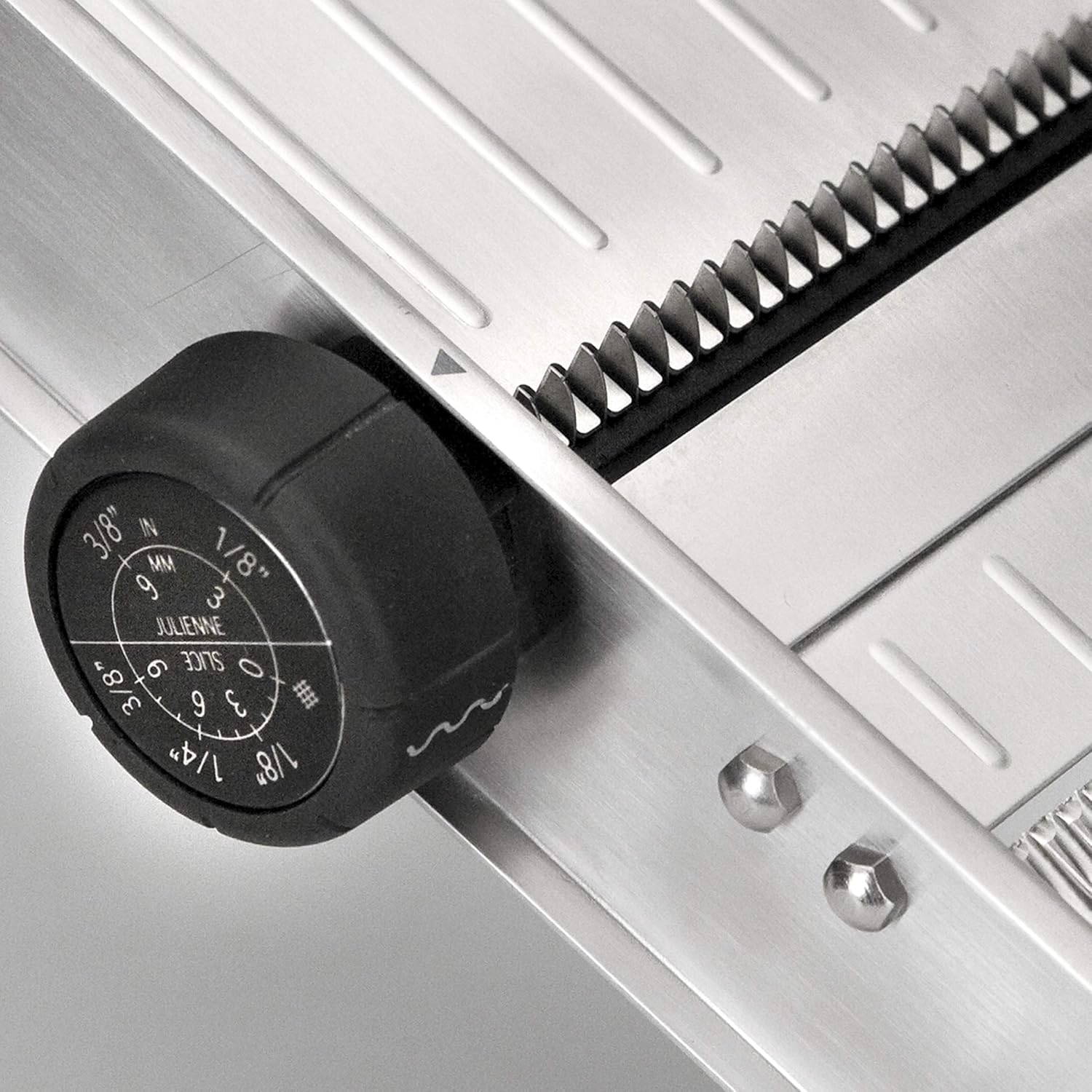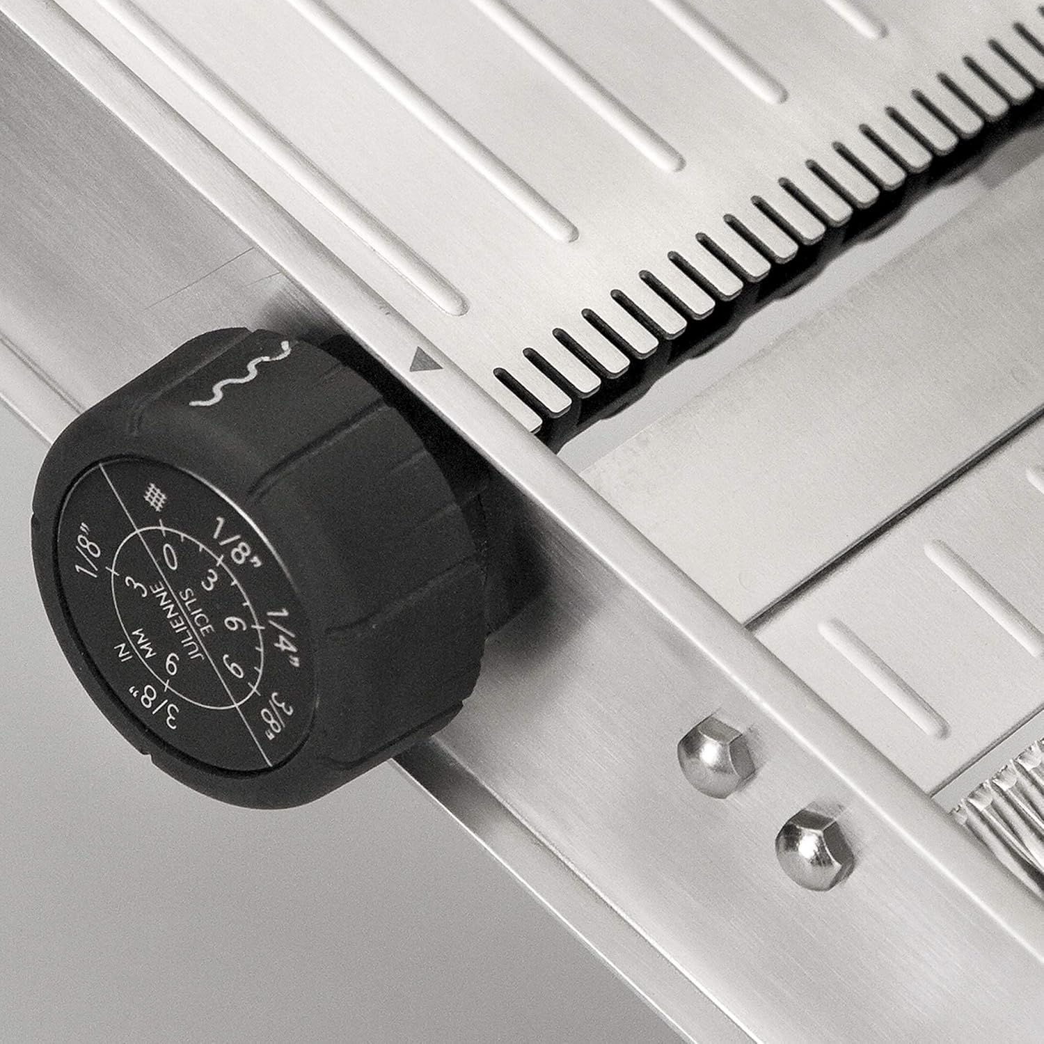 - 4 Arten des Schneidens: 1) Glatter Schnitt (einstellbare Dicke für Scheiben zwischen 0-3-6-9mm); 2) Juliana Schnitt (3mm Streifen); 3) Juliana Schnitt (9mm Streifen); 4) Wellenschnitt