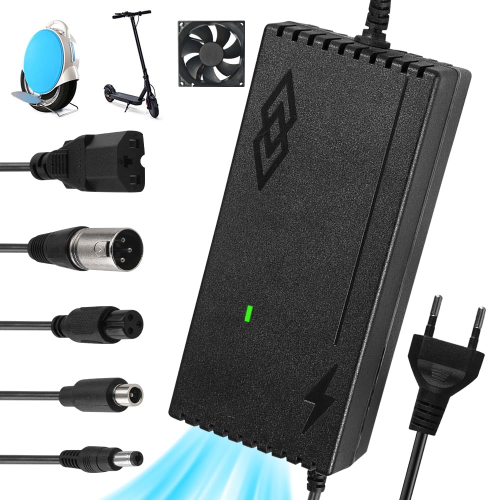 - 【Gutes Wärmeableitungsdesign】Das Lithium-Ladegerät besteht aus einem Aluminium-Kühlkörper, Im Vergleich zu den meisten Ladegeräten auf dem Markt verfügt unser Ladegerät für Scooter über einen eingebauten Lüfter, um die Wärme effizient zu