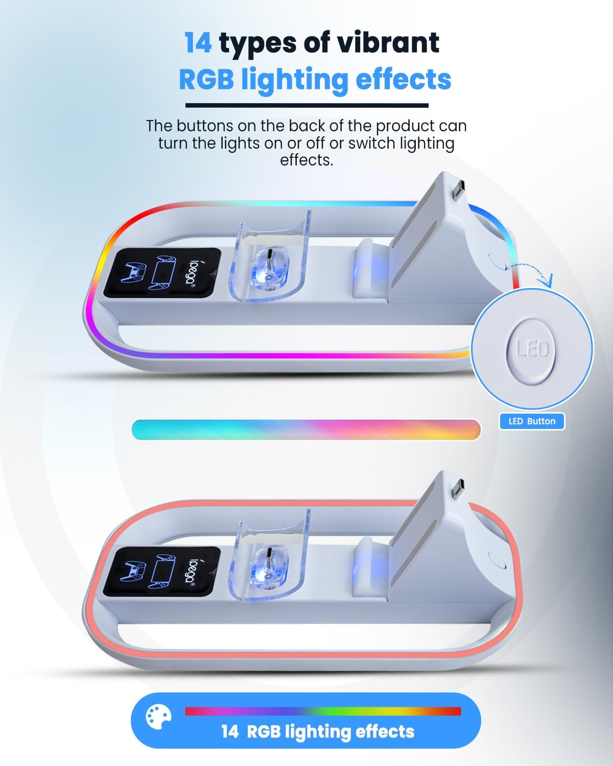 - RGB-Lichteffekte:Die hintere Taste dieses PS Portal Ladestation verfügt über 14 verschiedene RGB-Lichteffekte, mit denen Sie das Licht ein- oder ausschalten und zwischen verschiedenen Lichtmodi wechseln können. Dies verleiht Ihrem Gaming-Setup eine