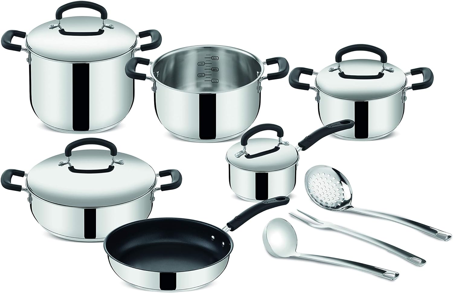 - TOPFSET: 13-teiliges Lagostina Topfset: Topf Ø 22 cm, tiefe Kasserolle mit 2 Griffen Ø 18 und 22 cm, niedrige Kasserolle Ø 26 cm, Kasserolle mit langem Griff Ø 14 cm, Bratpfanne Ø 26 cm, Deckel Ø 14, 18, 22 und 26 cm, Kochlöffel, Schaumlöffel und