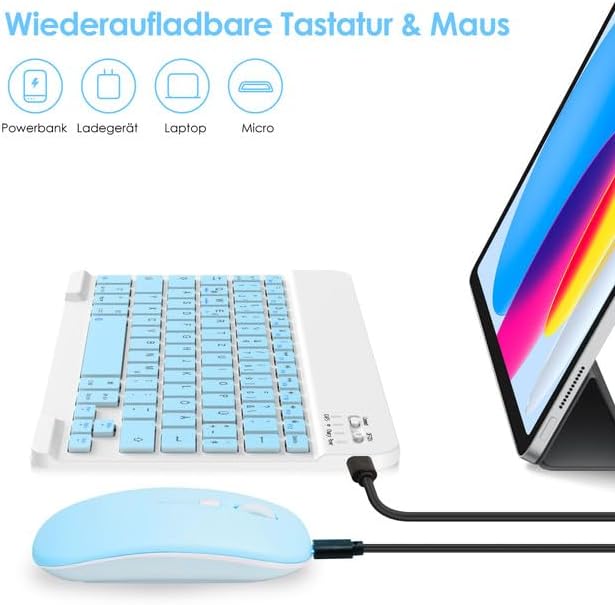 - 🔋【Drahtlos & Wiederaufladbar】Die drahtlose Verbindung der Tastatur mit Ihren Mobilgeräten wie Tablets und Mobiltelefonen bietet mehr Komfort beim Tippen, Reichweite bis zu 10 m. Über das mitgelieferte USB-C-Kabel 30 Tage Dauerbetrieb oder 100