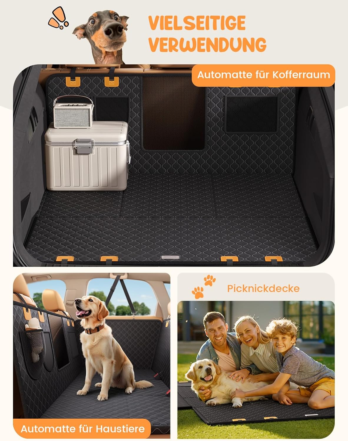 - 【3-IN-1-Schutzmatte - Unverzichtbar für Reisen】Diese Haustier Schutzmatte für Autositz ist nicht nur ein komfortabler Platz für euer Haustier, sondern kann auch als grosse SUV-Kofferraum-Matte dienen. Ausgeklappt kann sie sogar zu einem