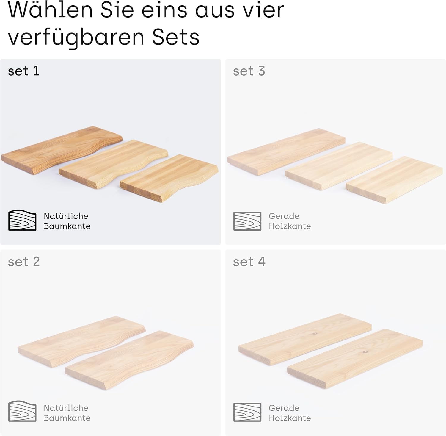 - 𝐖ä𝐡𝐥𝐞 𝐝𝐞𝐢𝐧𝐞𝐧 𝐒𝐭𝐢𝐥: Entscheide dich zwischen 4 Sets und 5 verfügbaren Farben: Set Nr. 1 und 3 beinhalten 3 Regale in unterschiedlichen Längen mit der Wahl zwischen einer geraden oder natürlichen Kante,
