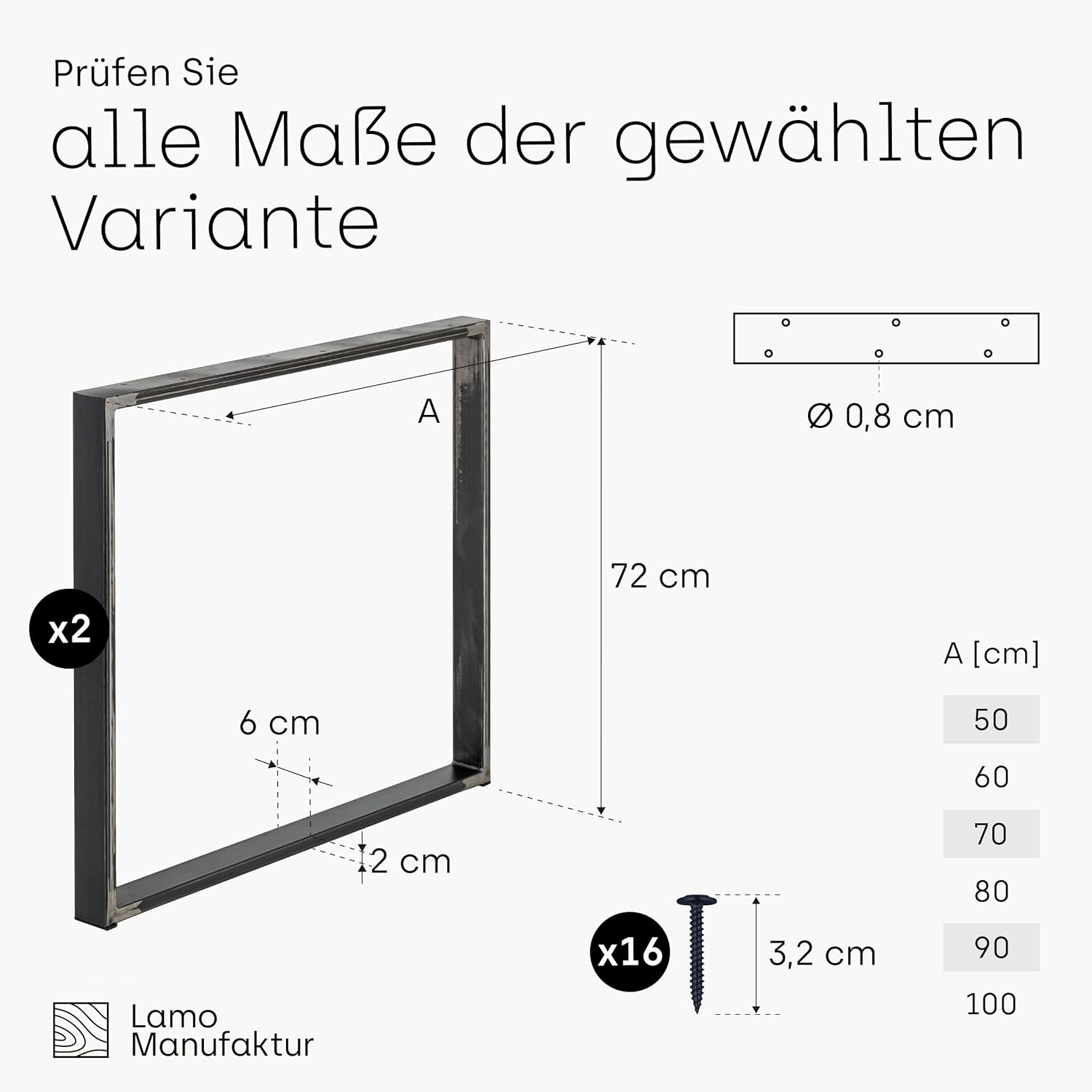 - Im Lieferumfang finden Sie: zwei Tischbeine und 16 Montageschrauben (3,2 cm - passend zu Tischplatten, die nicht dünner als 3,5 cm sind) - die Wahl der Tischplatte liegt bei Ihnen (wenn Sie sich für andere Materialien als Holz bzw. Holzfaserplatte