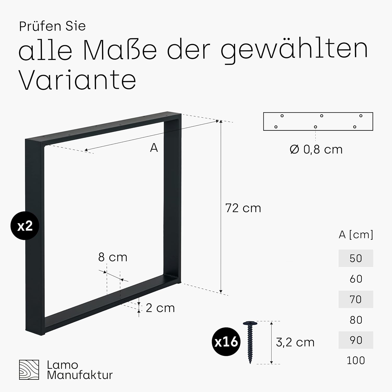 - Im Lieferumfang finden Sie: zwei Tischbeine und 16 Montageschrauben (3,2 cm - passend zu Tischplatten, die nicht dünner als 3,5 cm sind) - die Wahl der Tischplatte liegt bei Ihnen (wenn Sie sich für andere Materialien als Holz bzw. Holzfaserplatte