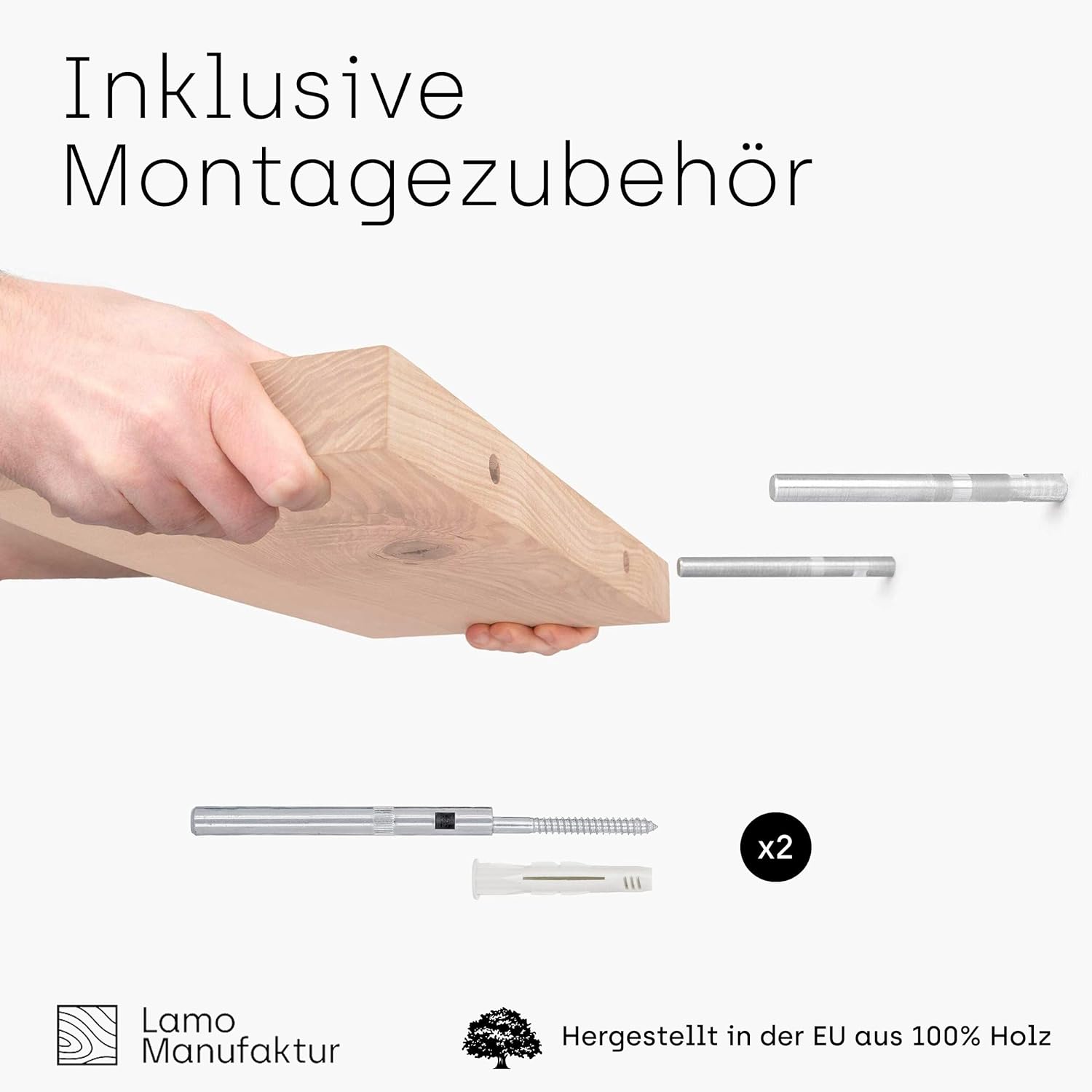 - Im Lieferumfang finden Sie alles, was Sie zur Montage Ihres Wandregals brauchen: unsichtbare, extrem belastbare Wandhalterung, die den Effekt eines frei schwebenden Holzstücks erzielen lässt sowie leistungsstarke Dübel. So können Sie sicher sein,