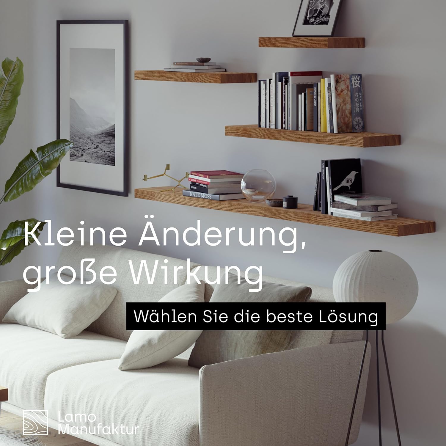 • Qualität bis ins Detail: Unsere Wandboards sind 38-40 mm stark und dadurch belastbar und äusserst stabil – max. Belastbarkeit: 120 kg – für einen zusätzlichen Schutz zweimal mit Remmers Hartwachs-Öl beschichtet – jedes Regal ist ein absolutes