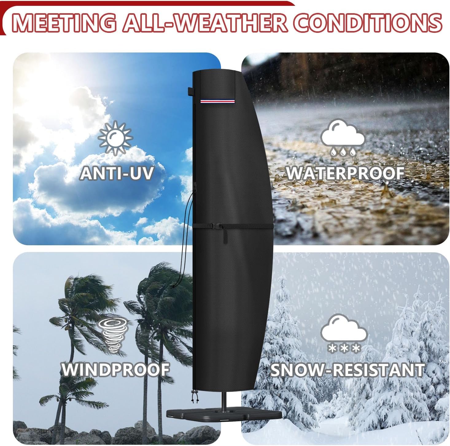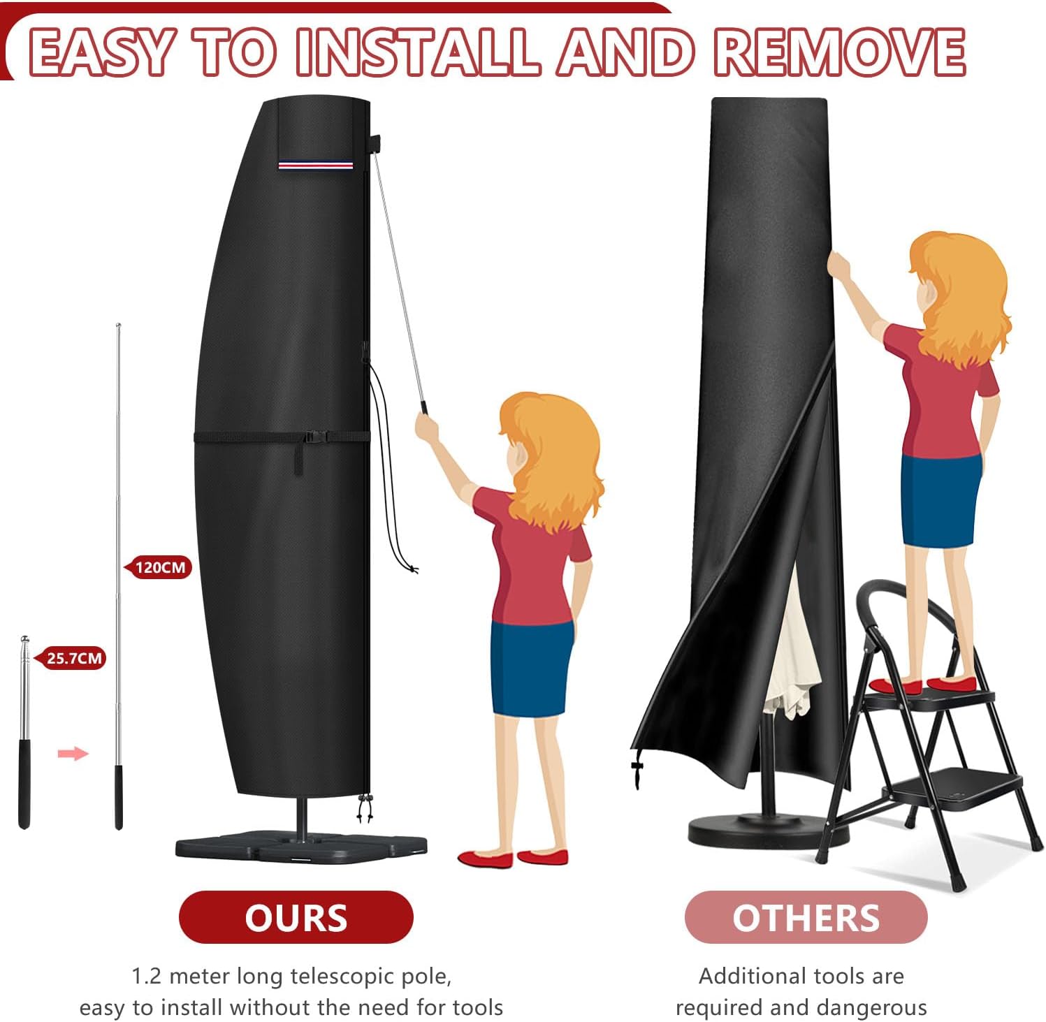 - 【Winddichte Sonnenschirmhülle mit Stab】Jede Sonnenschirm abdeckung hat eine 1,2m lange Teleskopstange und einen 2m langen wasserdichten Reissverschluss für einfache Montage und Demontage. Die Teleskopstange ermöglicht es Ihnen, die ampelschirm