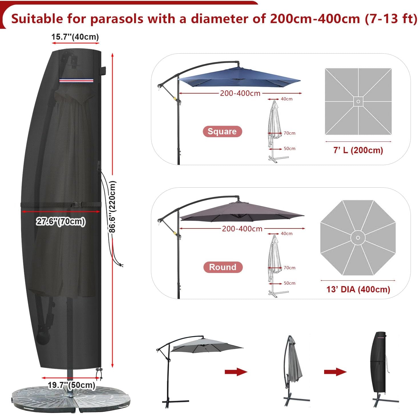 - 【Mehrere Grössen verfügbar】Ca. 220cm (Höhe) x 40cm (oben) / 70cm (Mitte) / 50cm (unten). Grosses Design, diese sonnenschirm hülle ist für die meisten freitragenden Schirme mit einem Durchmesser von 200cm-400cm (7-13 Füsse) geeignet. Wir haben