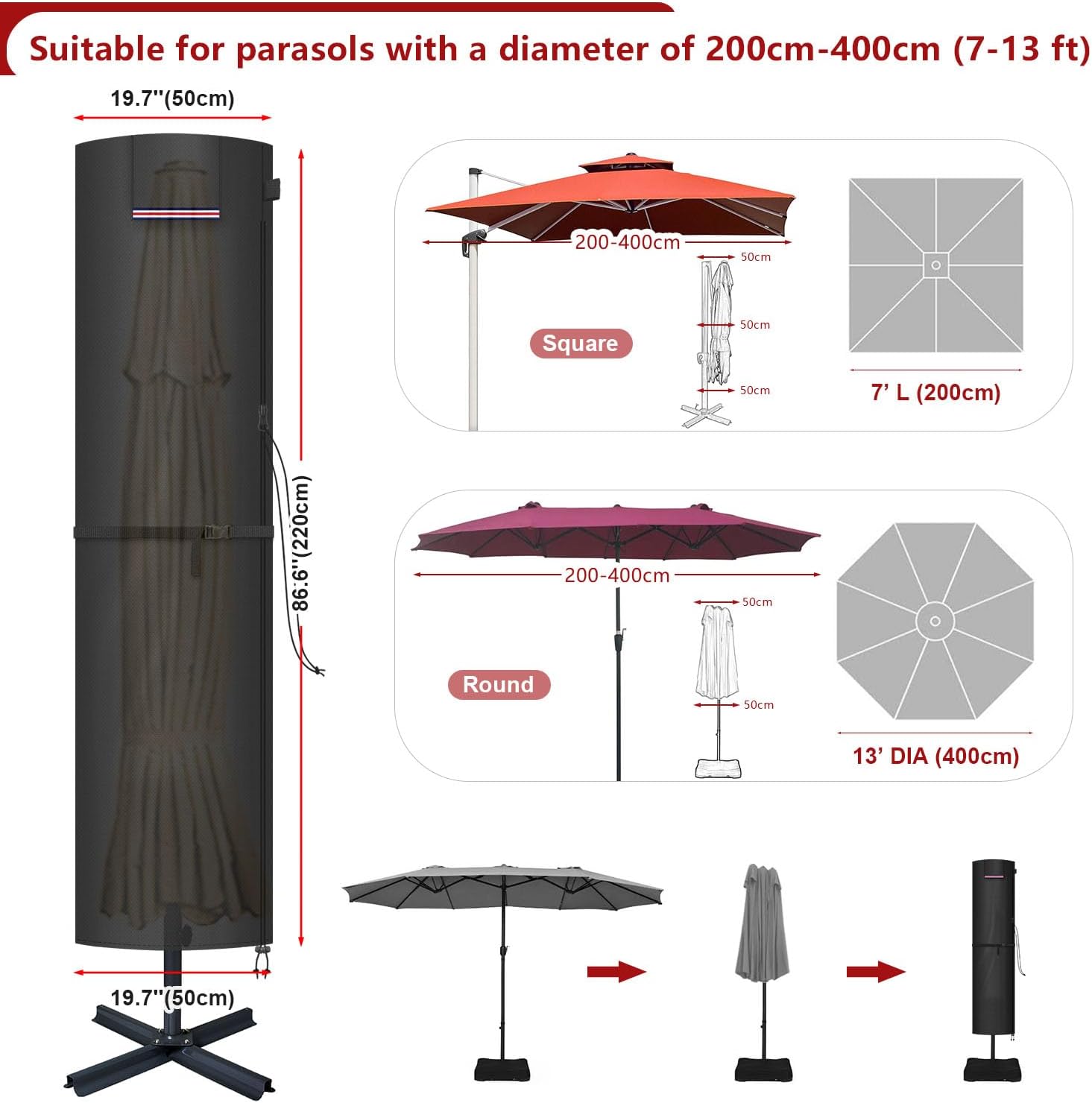 - ↪【Mehrere Grössen verfügbar】Ca. 220cm (Höhe) x 50cm (oben) / 50cm (unten). Grosses Design, diese sonnenschirm hülle ist für die meisten geraden Schirme mit einem Durchmesser von 200cm-400cm (7-13 Füsse) geeignet. Wir haben verschiedene