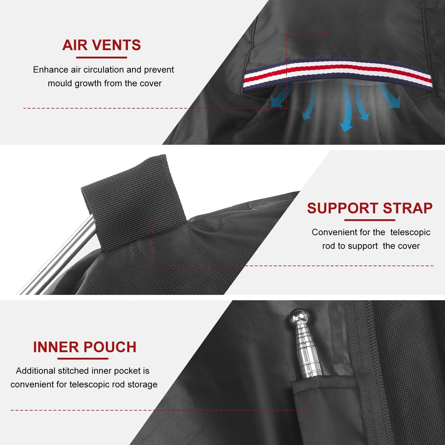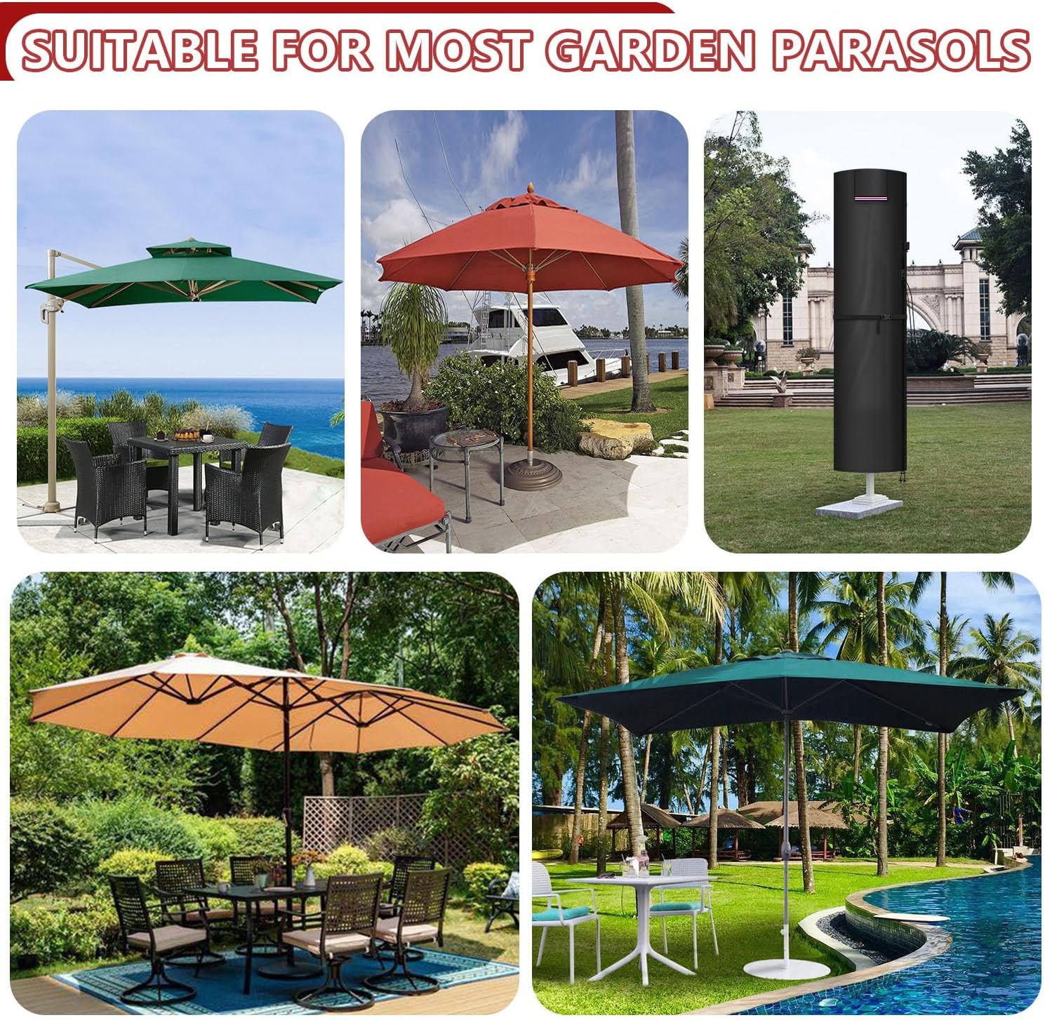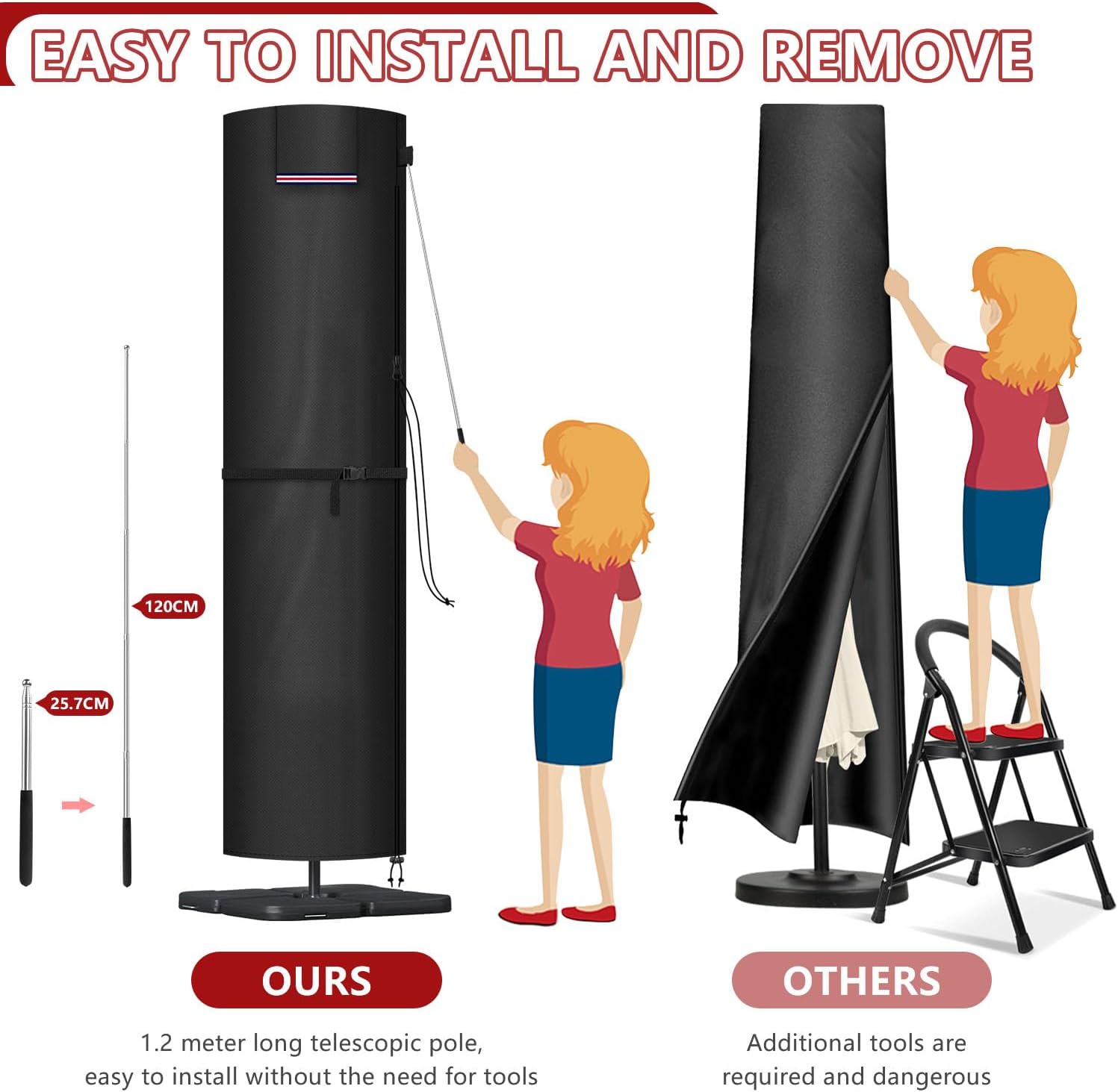 - ↪【Winddichte Sonnenschirmhülle mit Stab】Jede Sonnenschirm abdeckung hat eine 1,2m lange Teleskopstange und einen 2m langen wasserdichten Reissverschluss für einfache Montage und Demontage. Die Teleskopstange ermöglicht es Ihnen, die ampelschirm