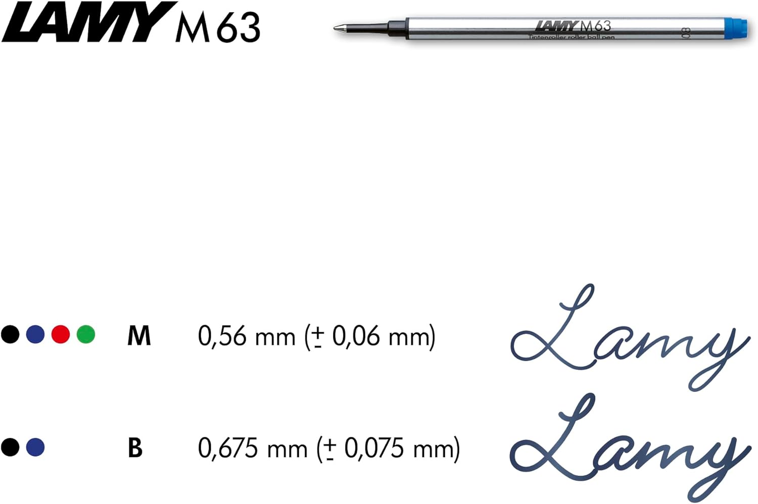 - Der Rollpen ist mit einer LAMY M 63 M Tintenrollermine ausgestattet, welche in verschiedenen Varianten und Ausführungen erhältlich ist: schwarz, blau, rot in den Strichbreiten F, M und B