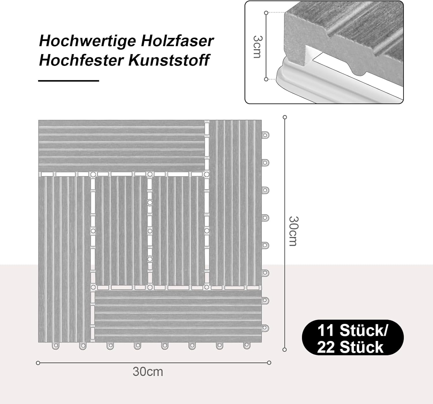 - Entwässerung & Rutschfestigkeit: Die einzigartige Drainage sorgt dafür, dass Wasser rechtzeitig abfliessen kann, während das Anti-Rutsch-Design eine sichere Nutzung ermöglicht. Die WPC-Fliesen eignen sich für den Einsatz im Innen- und Aussenbereich,
