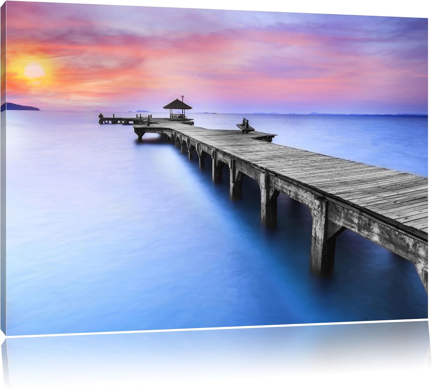 langer Steg mit kleinem Pavillon schwarz/weiss Format: 100x70 auf Leinwand, XXL riesige Bilder ferti