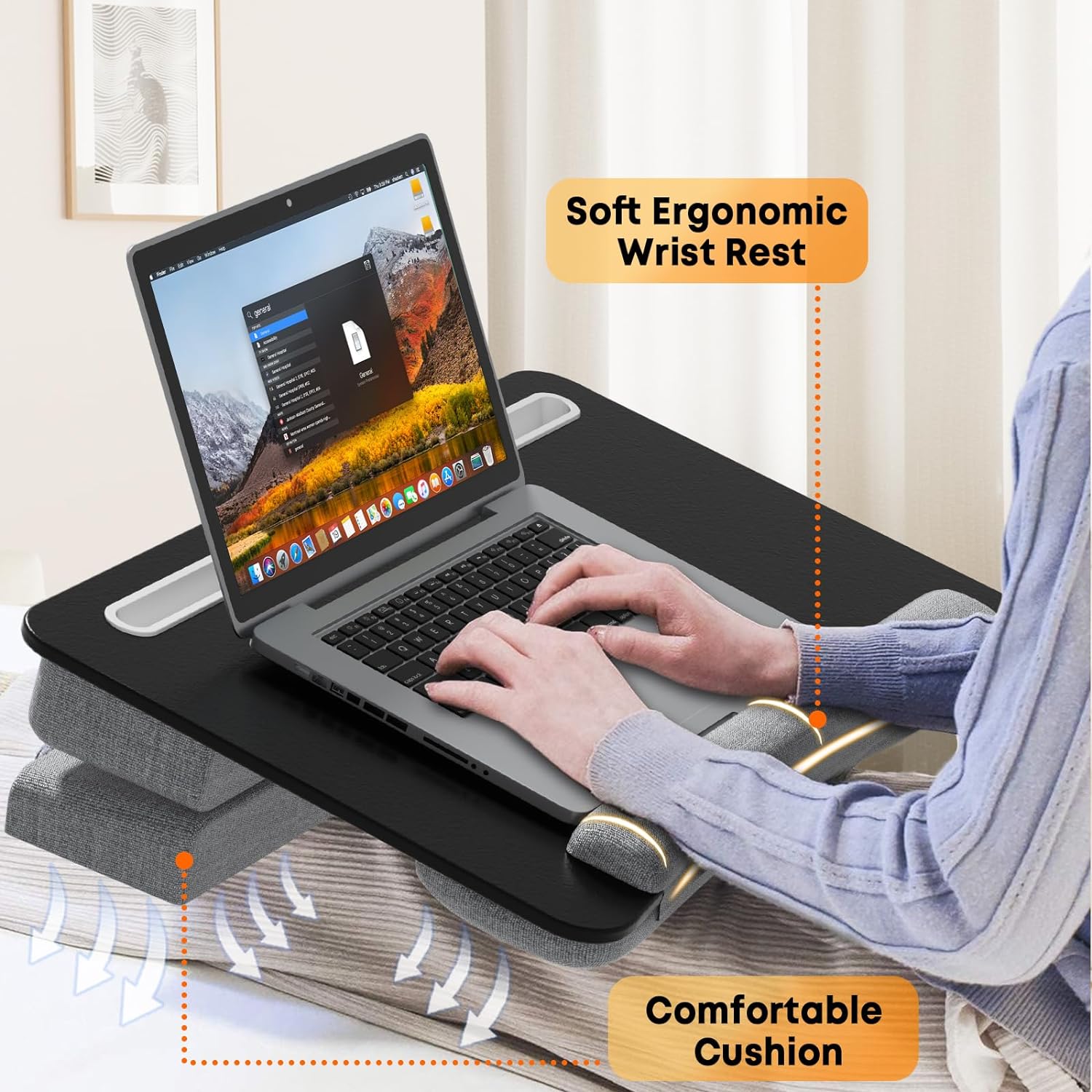 • 【Komfortabler Sitz und Handgelenkpolster】Der Laptoptisch ist mit hochelastischem Formgedächtnis-Schaumstoff ausgestattet, der für Stabilität und Halt sorgt. Das weiche Handgelenkpolster ist ergonomisch geformt, um ein Verrutschen des Laptops zu