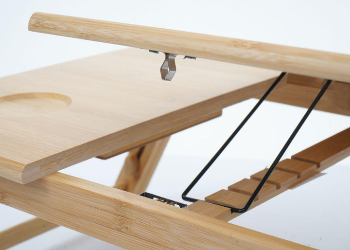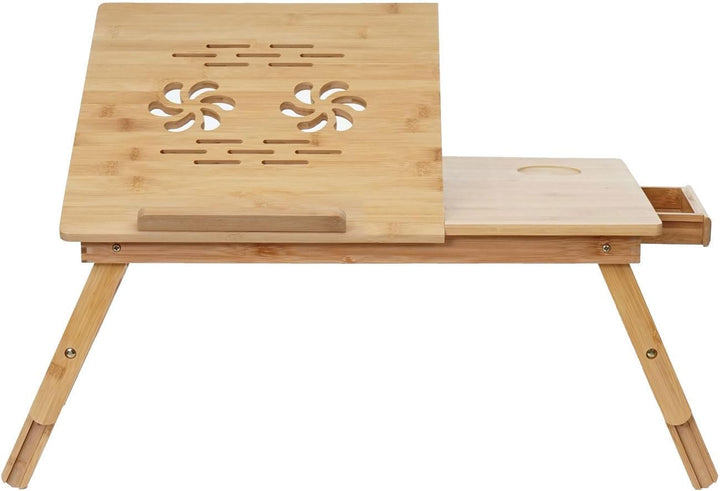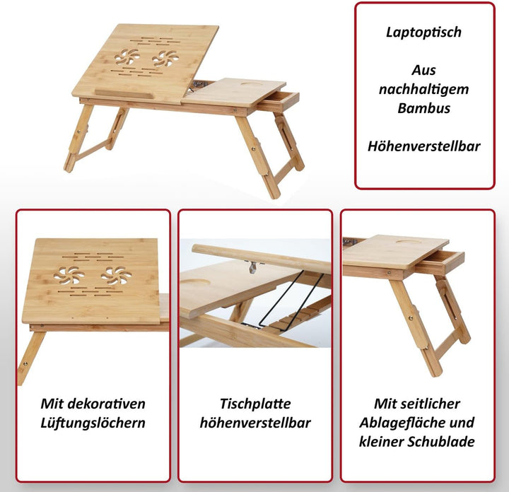 - Lieferumfang: 1x Laptoptisch | Mit blumenförmigen und gestreiften Lüftungslöcher | Tisch höhenverstellbar | Mit Schublade | Ablagefläche | Tischplatte verstellbar | Material: Bambus | Komplett montiert