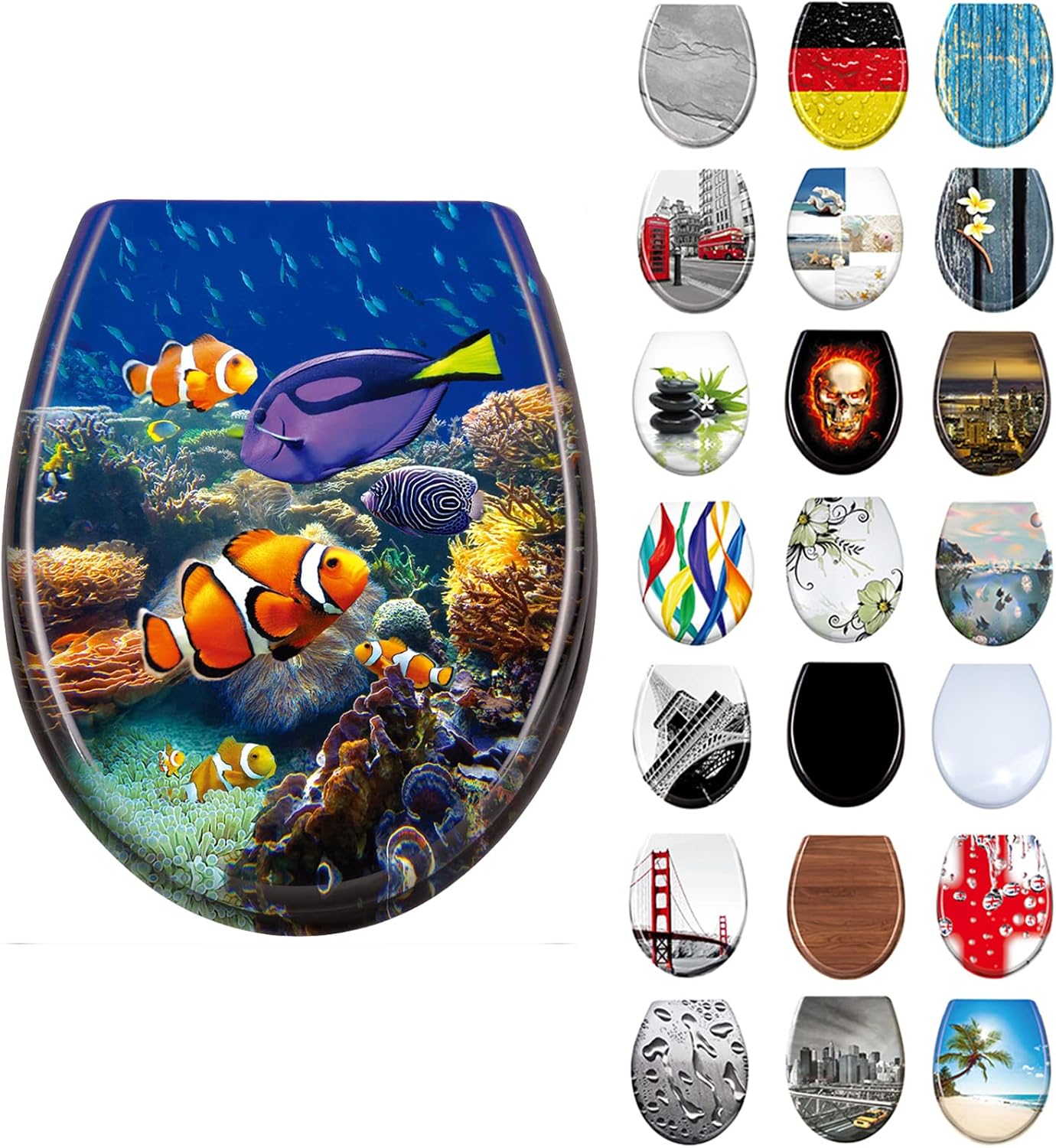 - đăUniverselles DesignăAufgrund der "O"-Form des Toilettensitzes passt er auf alle gĂ€ngigen hĂ€ngenden und stehenden Toiletten. Modernes U-förmiges Design mit stilvollen Bildern, perfekt fĂŒr Badezimmer, Wohnungen, Restaurants, KaufhĂ€user und