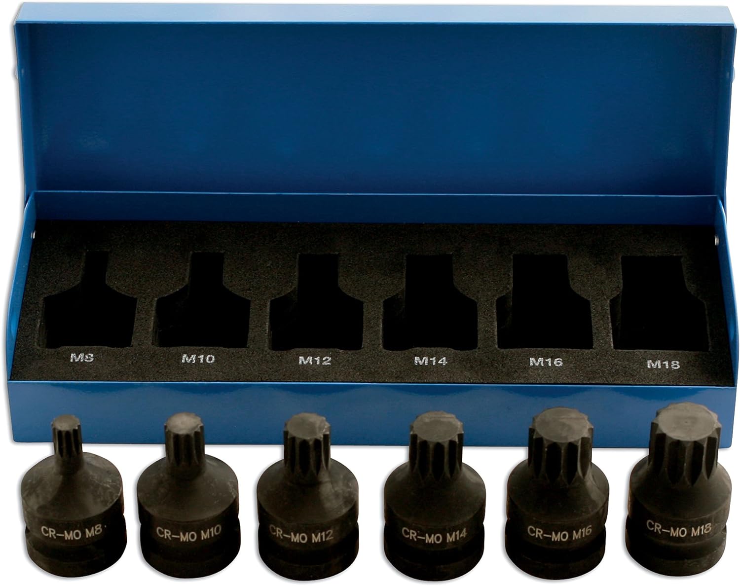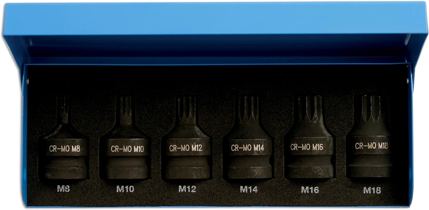 - 1,27 cm D-Steckschlüsseleinsätze x 40 mm lang: M8, M10, M12, M14, M16 und M18.