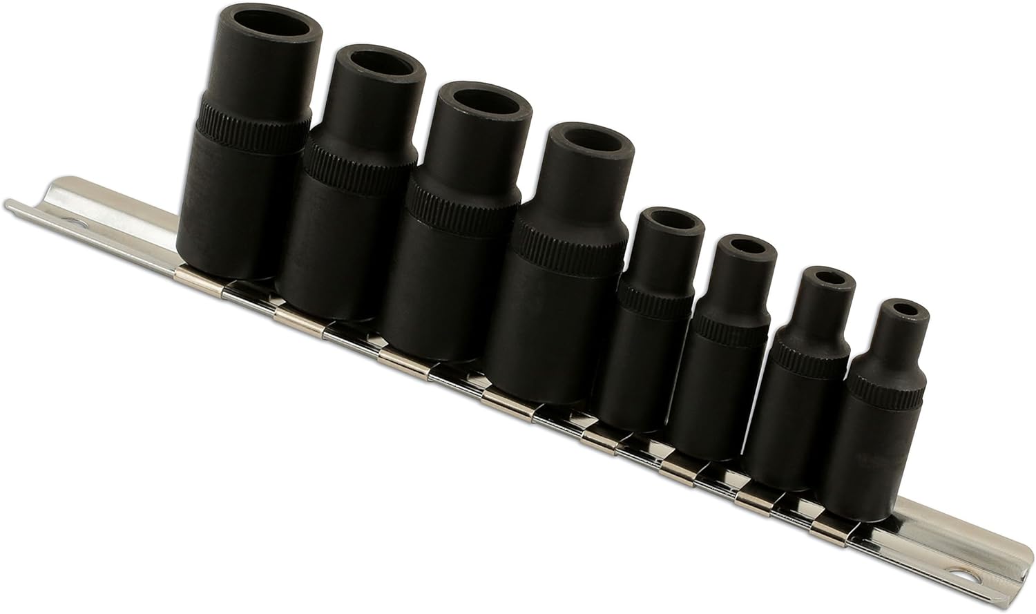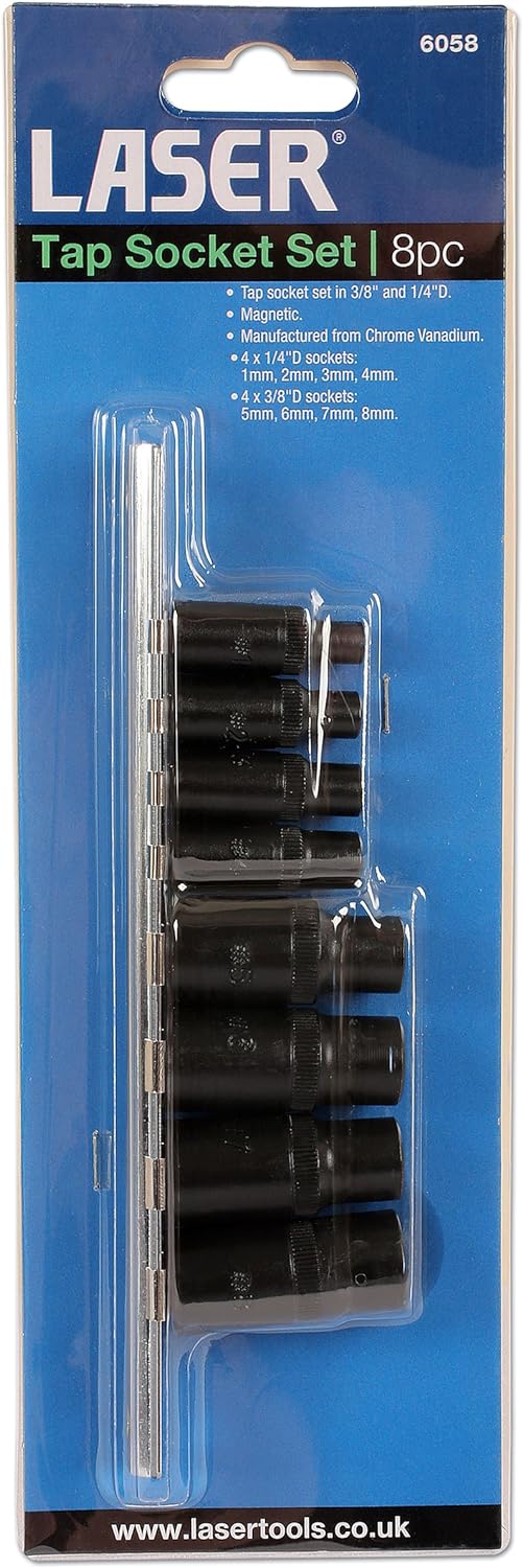 - 4 x 1/4"-Einsätze: 1 mm/2 mm/3 mm/4 mm 4 x 3/8"-Einsätze: 5 mm/6 mm/7 mm/8 mm Auf einer Halterleiste