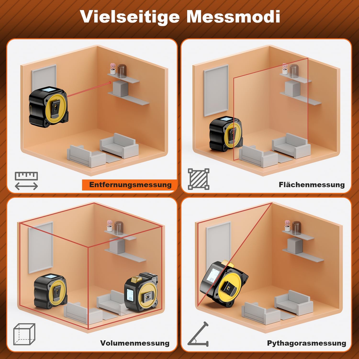 - Breite Anwendung: massband entfernungsmesser Ideal für Architekten, Handwerker und Heimwerker– ob für Möbeldesign, Inneneinrichtung, Bauprojekte oder Outdoor-Aktivitäten– perfekt für grosse Flächen wie Räume, Gebäude, Lagerhallen und mehr.