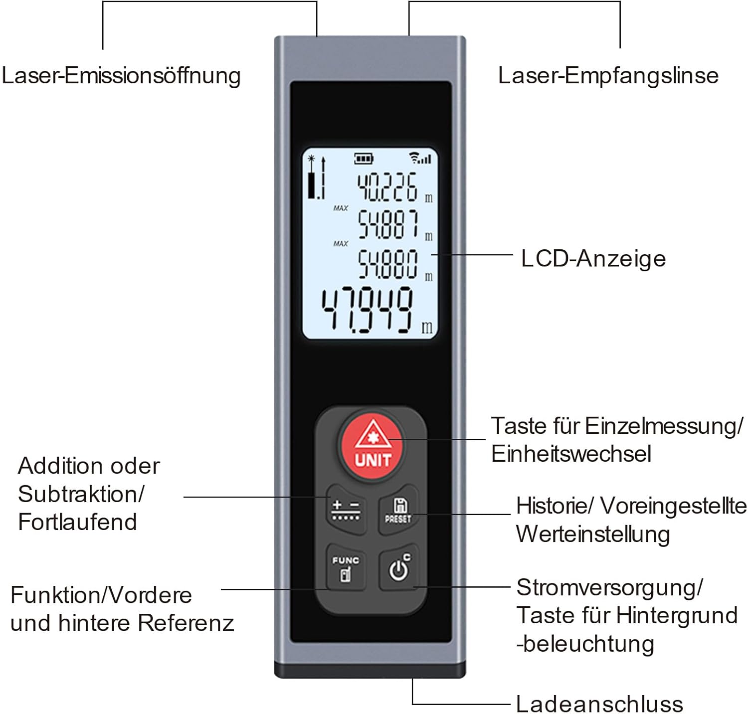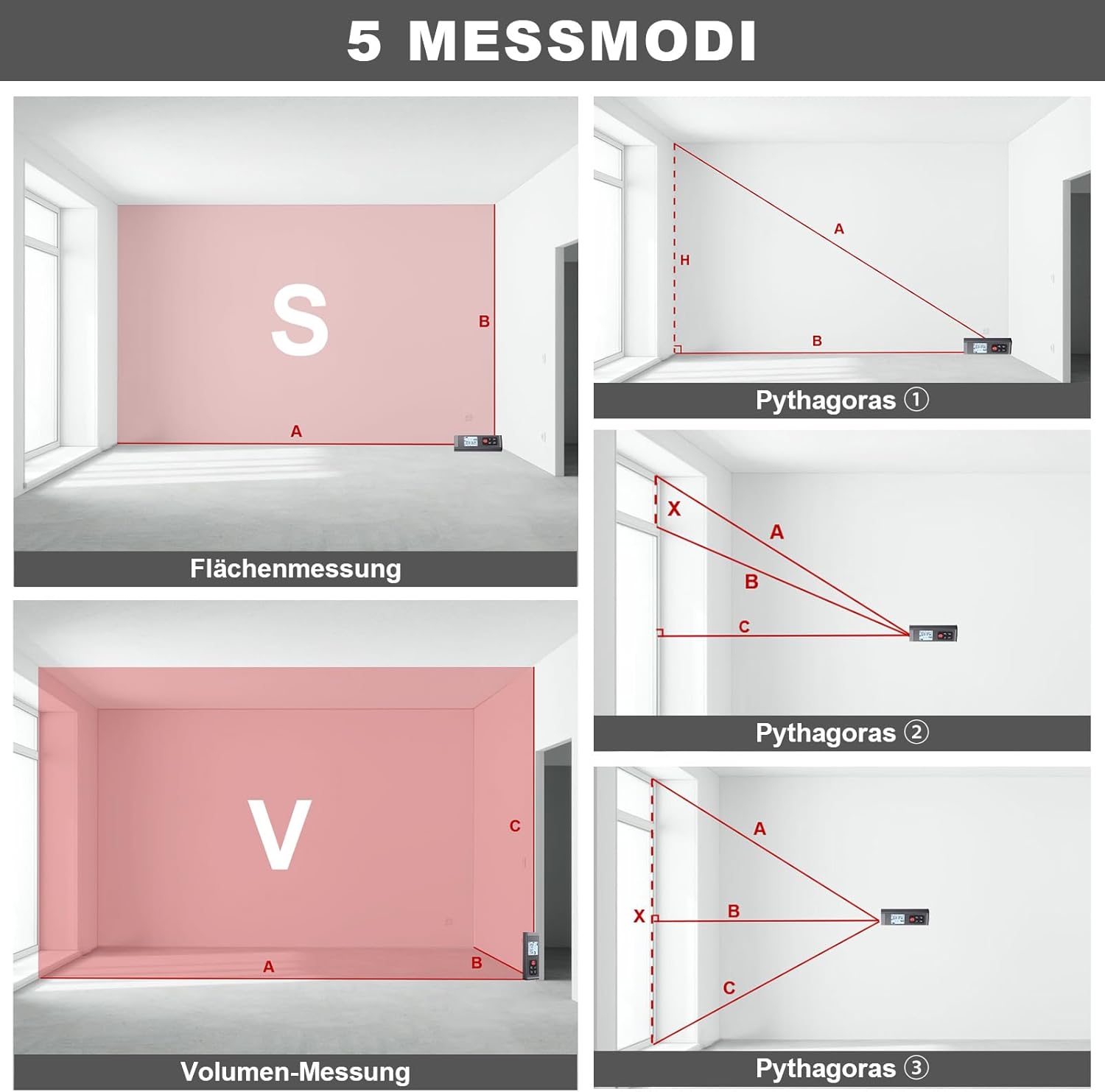 - Diverse Messmodi: Der laser distanzmesser hat mehrere Funktionen, die Fläche, Entfernung, Länge, Volumen, kontinuierliche Messung lasermessgerät für räume und pythagoreische Messung unterstützen, um verschiedene Messungen zu erfüllen. Weit