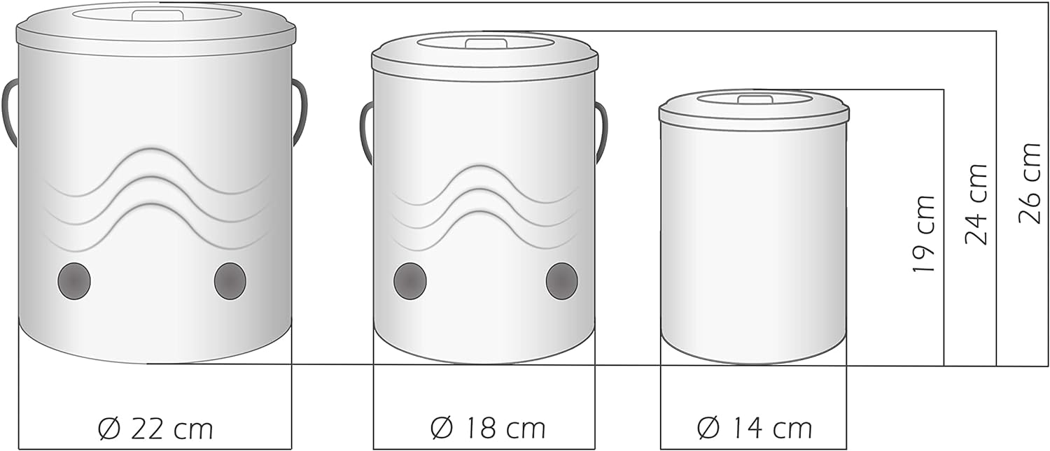 - Ausgestattet ist unser grosses Behälter Set aus: 1x Kartoffeldose ca. 22 cm Ø x 26 cm, 1x Ziebeltopf ca. 18 cm Ø x 24 cm sowie 1x Knoblauchdose ca. 14 cm Ø x 19 cm.