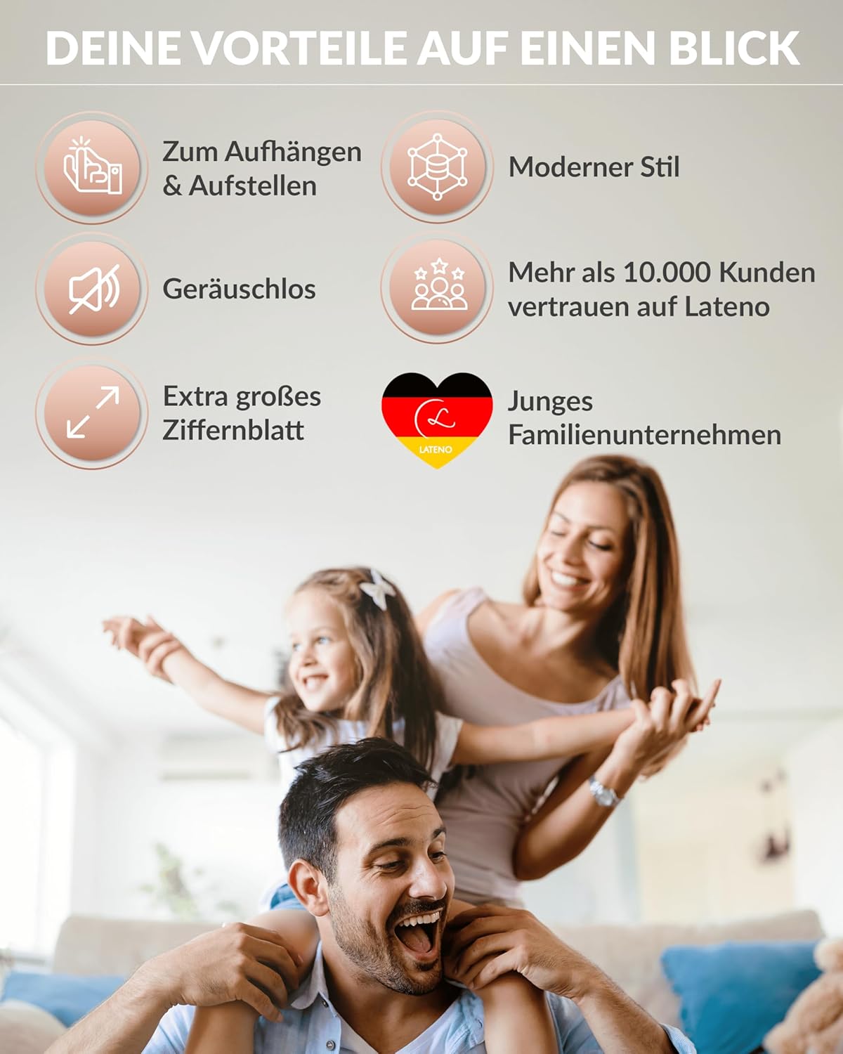 - KLASSISCHES DESIGN - Lateno Wand Uhr modern und klassisch. Eine Wand Uhr ohne Tickgeräusche im zeitlosen Design, welche ihre Räumlichkeiten verschönert.