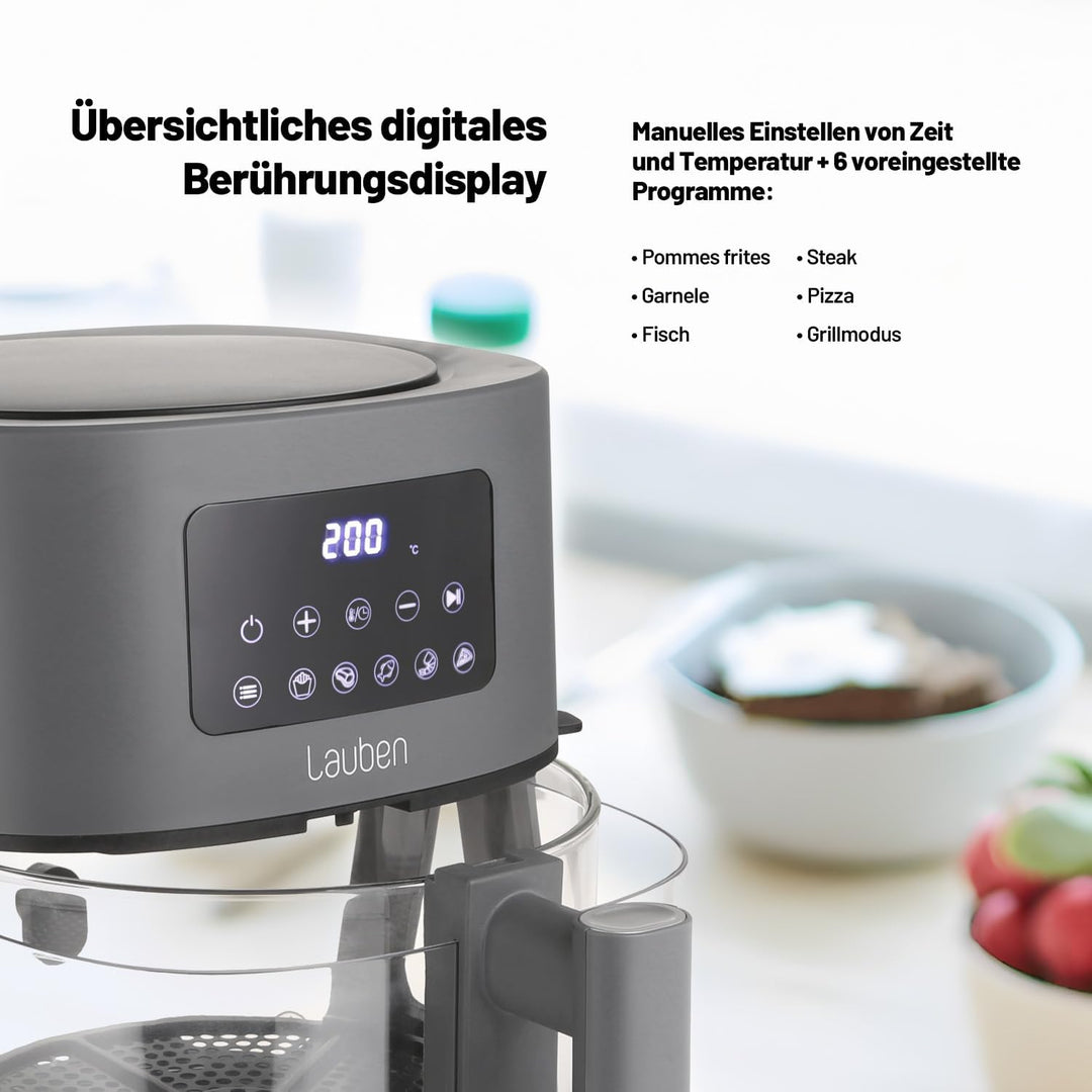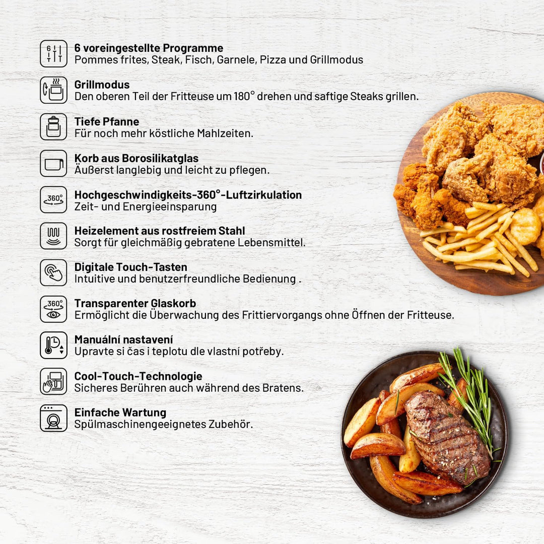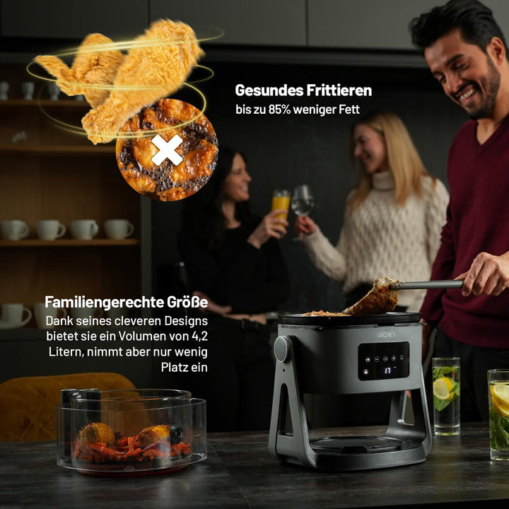 - BIS ZU 80 % WENIGER FETT - Mit Hilfe der Hochgeschwindigkeits-360°-Luftzirkulation können Sie jedes Gericht, einschliesslich Ihrer Lieblings-Bratkäse und Schnitzel, mit bis zu 80 % weniger Fett zubereiten. Infrarotlicht garantiert gleichmässige