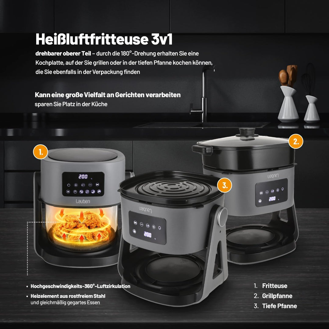 - 3in1: HEIssLUFTFRITTEUSE, GRILL, BRATPFANNE - Die Heissluftfritteuse verfügt über eine einzigartige Technologie zur 180°-Drehung des oberen Teils, die zusammen mit der Verwendung der tiefen Pfanne oder der Grillpfanne die Möglichkeiten der