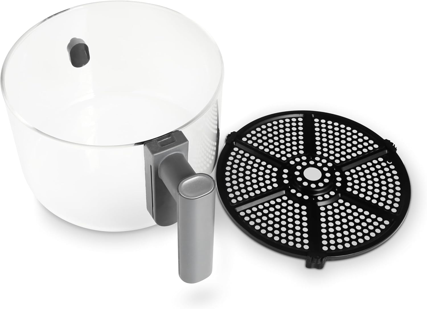 - EINZIGARTIGER GLASKORB UND SICHERHEITSABDECKUNG - Der Frittierkorb aus Glas hat mehrere Vorteile. Absolute Unbedenklichkeit, da kein Nachgeschmack oder Geruch in den Lebensmitteln verbleibt, wie bei Teflon oder Aluminium. Ausserdem haben Sie jederzeit