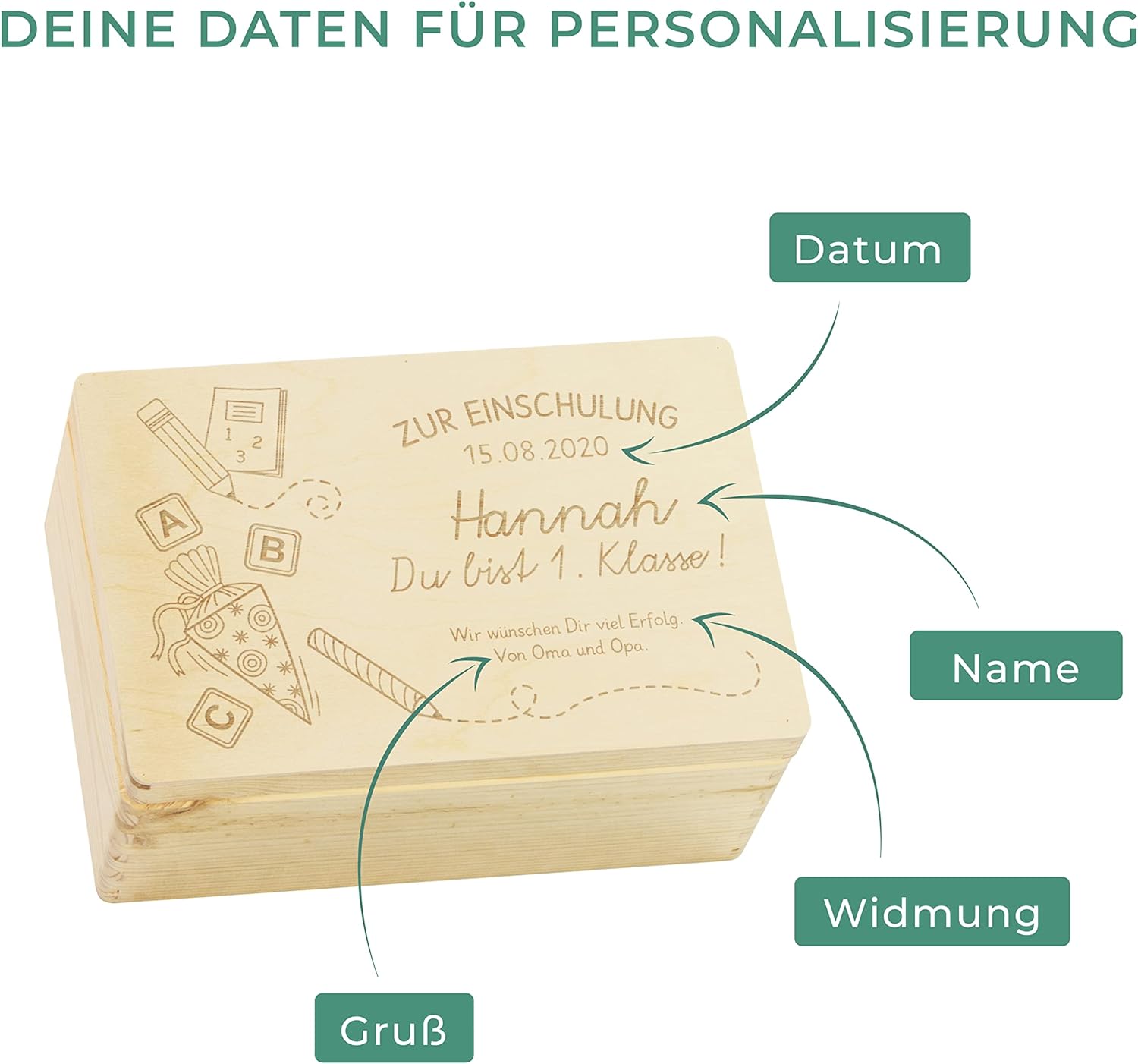• Individuell gravierte Geschenkbox zum Schulanfang. Ein Geschenk, mit dem die kleinen ABC-Schützen diesen aufregenden Tag für immer im Gedächtnis behalten
