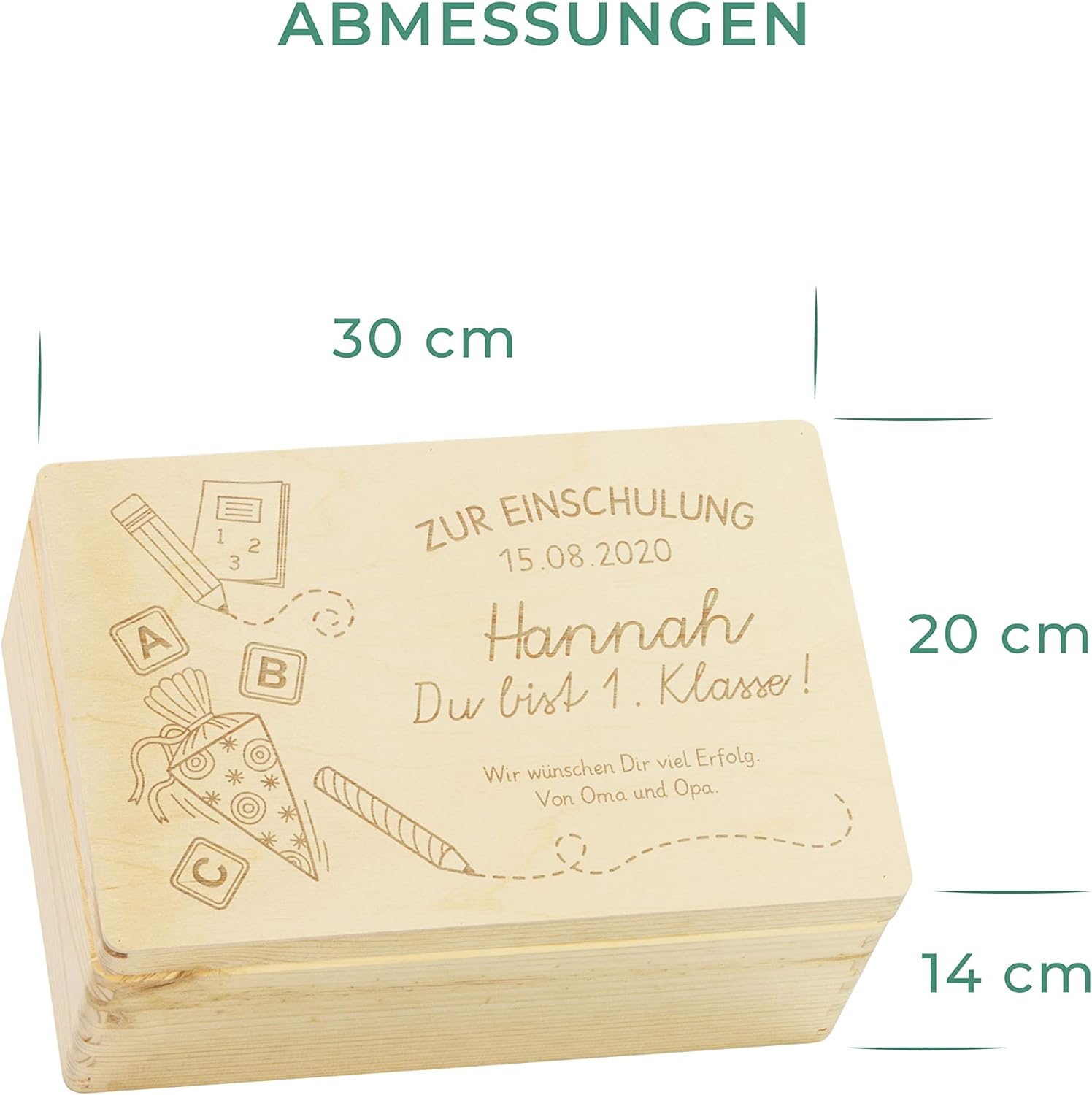 • Massives Kiefernholz aus Wäldern in der EU. Die unbehandelte Erinnerungskiste mit stabilem Deckel aus Vollholz begleitet die Erstklässler ein ganzes Leben lang