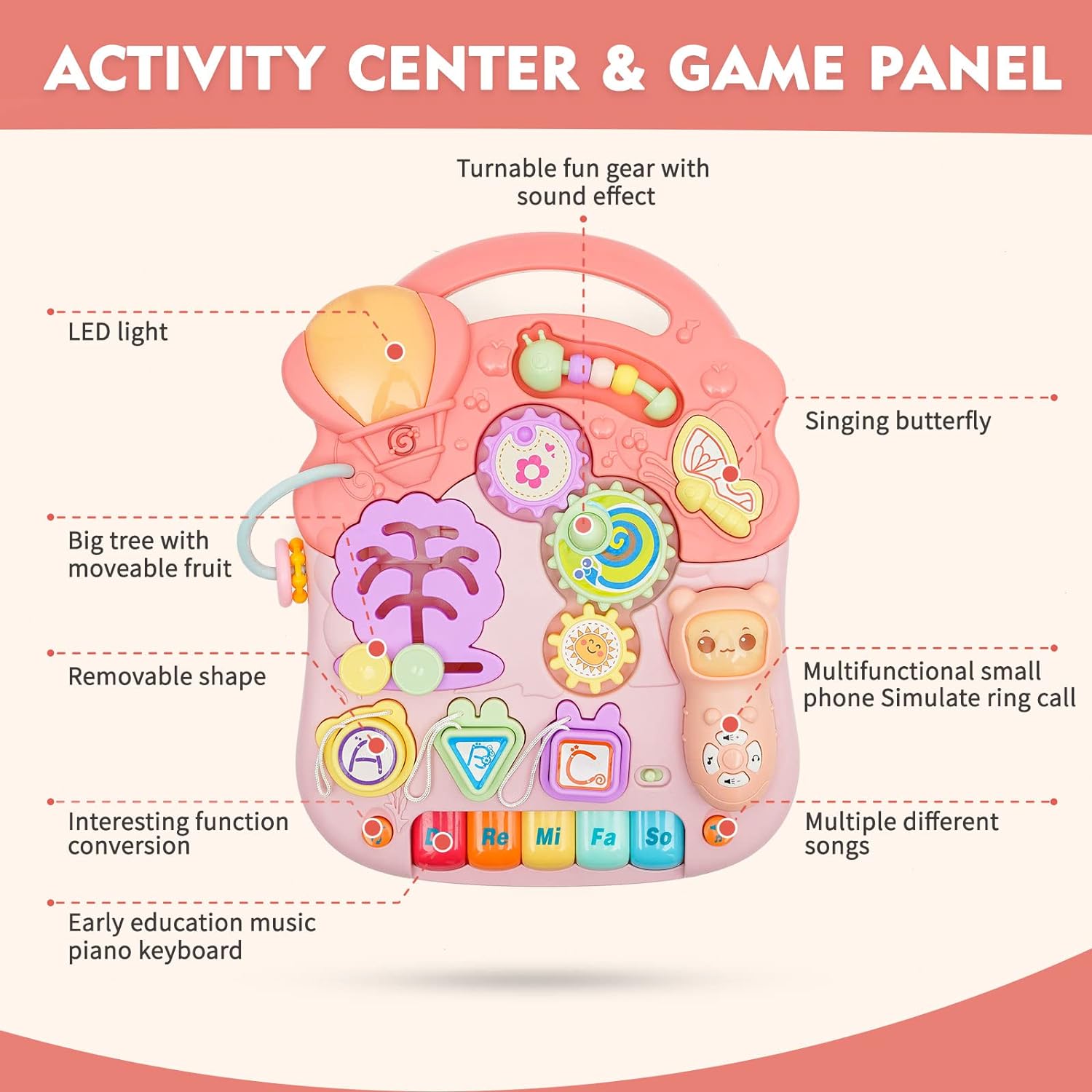 - Abnehmbares Spielpanel --- Das abnehmbare Panel mit niedlicher Knopfform bietet eine Vielzahl von Funktionen, wie z. B. Zahnradformen und Musik, damit das Baby spielen und lernen kann. Das Panel kann die Hand-Auge-Koordination des Babys vollständig