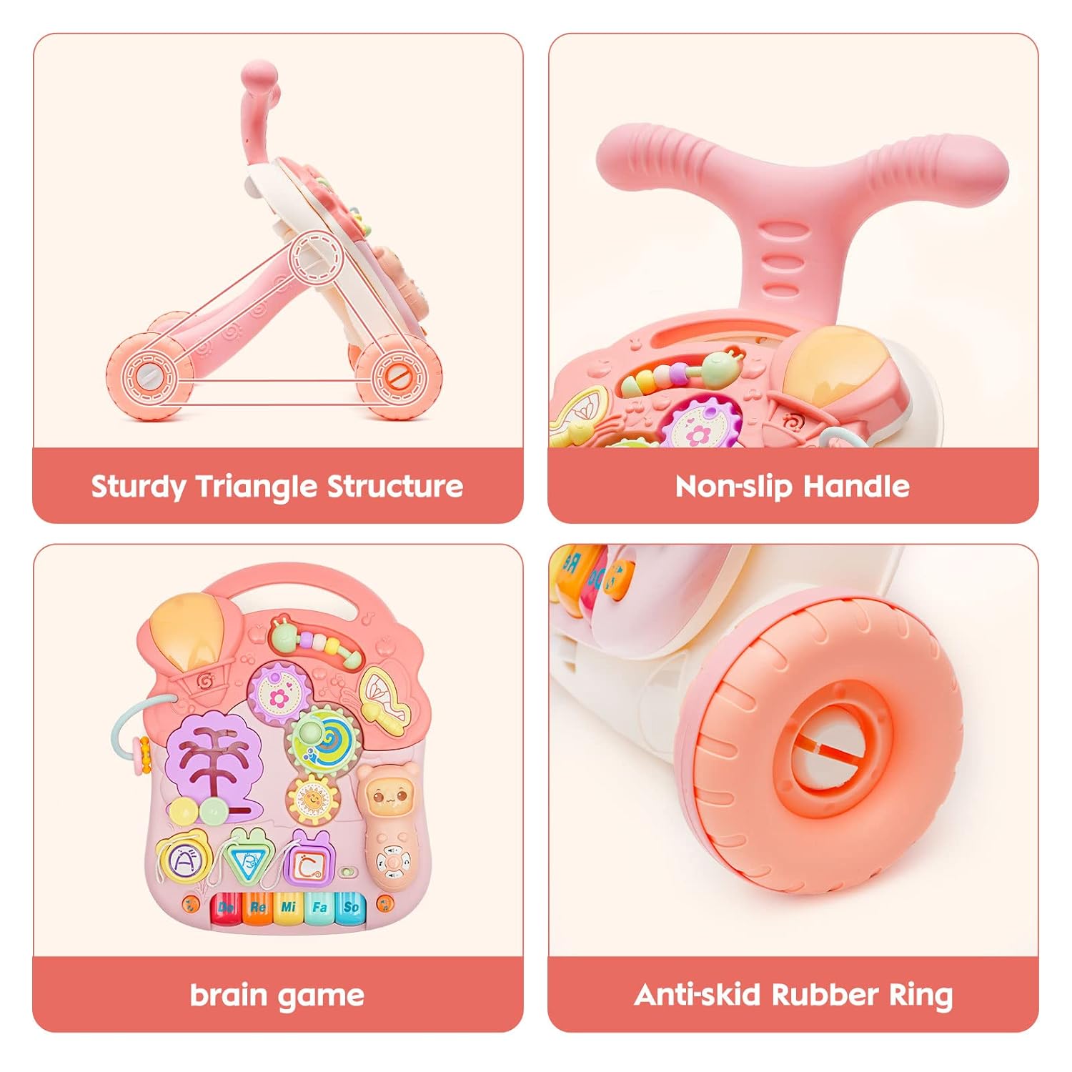 - Sicheres und langlebiges Material --- Dieser Gehhilfe besteht aus hochwertigen Materialien und ist langlebig für die langfristige gesundheitliche Nutzung des Babys. Gleichzeitig wurde der Lauflernwagen vollständig mit ASTM getestet, um Ihrem Baby das