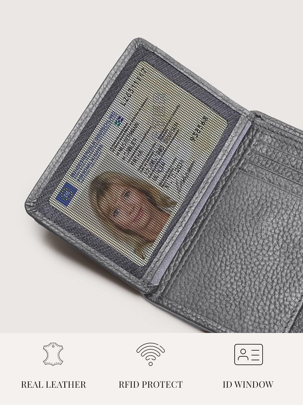 • RFID-SCHUTZ: Dank eingebautem RFID-Blocker Kreditkarten / Personalausweis, etc. vor unbefugten Scans durch Lesegeräte geschützt.