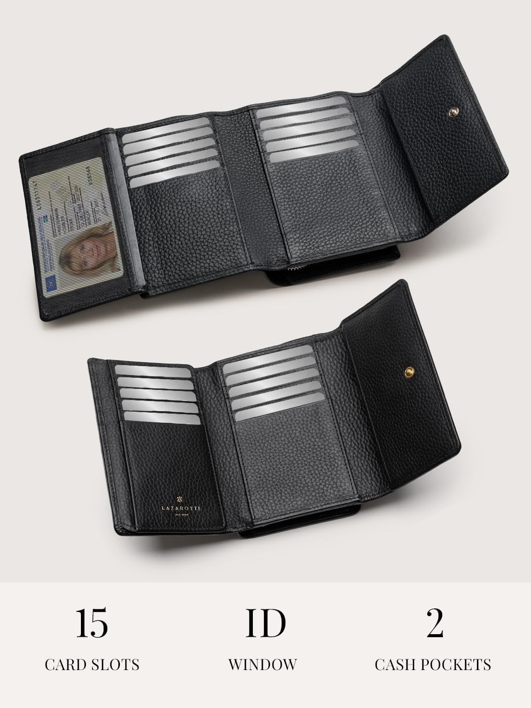 • KAPAZITÄT: Der Geldbeutel hat 15 Kreditkartenfächer, 4 Steckfächer, 2 Scheinfächer sowie ein grosses Reissverschlussfach auf der Rückseite für Münzen (inkl. Teiler & zwei weiteren Steckfächern). Der Überschlagverschluss wird durch einen