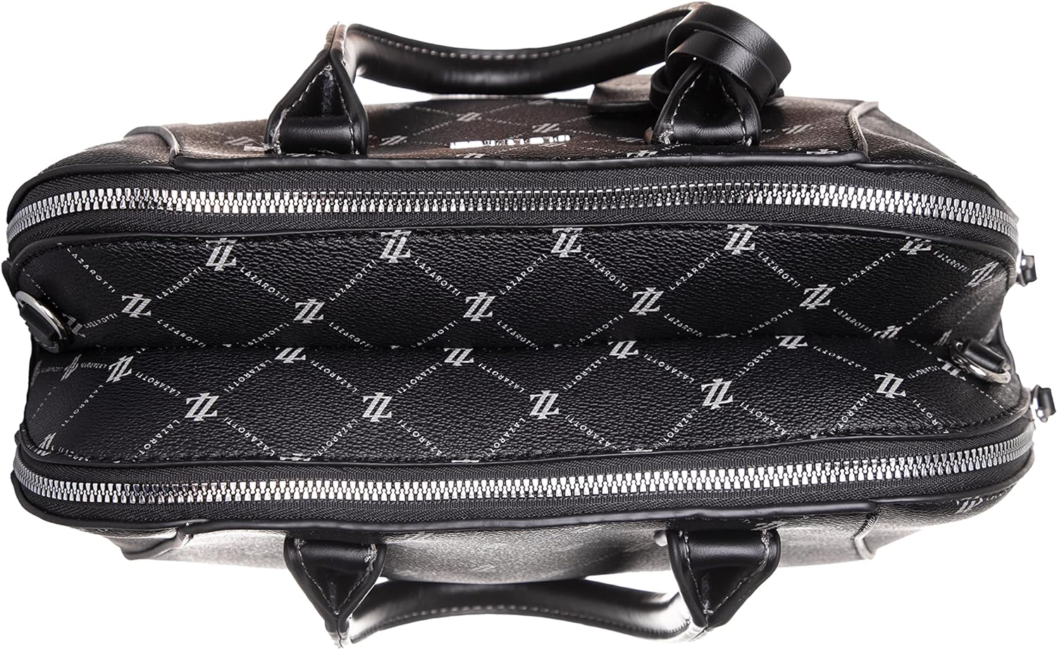 PRODUKTBESCHREIBUNGEN Die leichte und kompakte Henkeltasche von Lazarotti Palermo ist der ideale Begleiter für den Alltag. Mit Massen von 28 x 12 x 22 cm und einem Gewicht von nur 570 Gramm bietet sie grosszügig Platz für die wichtigsten Alltagsgegenstände und noch mehr. Das Volumen beträgt ca. 7 Liter, sodass alles Notwendige bequem verstaut werden kann. Die Tasche überzeugt nicht nur durch ihre praktische Grösse, sondern auch durch ihre stilvolle Ausstattung. Sie kann entweder in der Hand oder mit dem abnehmbaren, längenverstellbaren Schulterriemen getragen werden. Dadurch ist sie sowohl als Henkeltasche, Schultertasche oder Crossbody Bag vielseitig einsetzbar. Zwei Hauptfächer ermöglichen eine übersichtliche Aufbewahrung und können separat durch Reissverschlüsse sicher verschlossen werden. Im ersten Hauptfach befindet sich ein praktisches Steckfach, während das zweite Hauptfach ein kleines Reissverschlussfach bietet. Hergestellt aus hochwertigem Synthetikmaterial ist diese Tasche nicht nur formstabil, sondern auch robust, wasserabweisend, abriebfest und leicht zu reinigen. Das trendige Logo Print Design, die glänzenden Metallelemente sowie das haptisch hochwertige Markenetikett verleihen der Tasche einen edlen Look und werten jedes Outfit auf. Ob im Büro, in der Freizeit oder bei besonderen Anlässen wie Hochzeiten oder Kurztrips - diese zeitlose Henkeltasche ist ein Must-have. Sie bietet genug Platz für die wichtigsten Dinge und ist dabei leicht und kompakt. Zudem eignet sie sich hervorragend als Geschenk für Mädchen, Ehefrauen, Mütter oder Freundinnen zu verschiedenen Anlässen wie Weihnachten, Geburtstag, Valentinstag, Jahrestag oder Muttertag. Unsere Henkeltasche wurde mit Leidenschaft und Sachverstand designt und entwickelt. Entdecke die hervorragende Qualität, die funktionale Gestaltung und das geschmackvolle Design von Lazarotti Palermo. Diese Tasche ist der perfekte Begleiter für jeden Anlass und wird dich begeistern.
