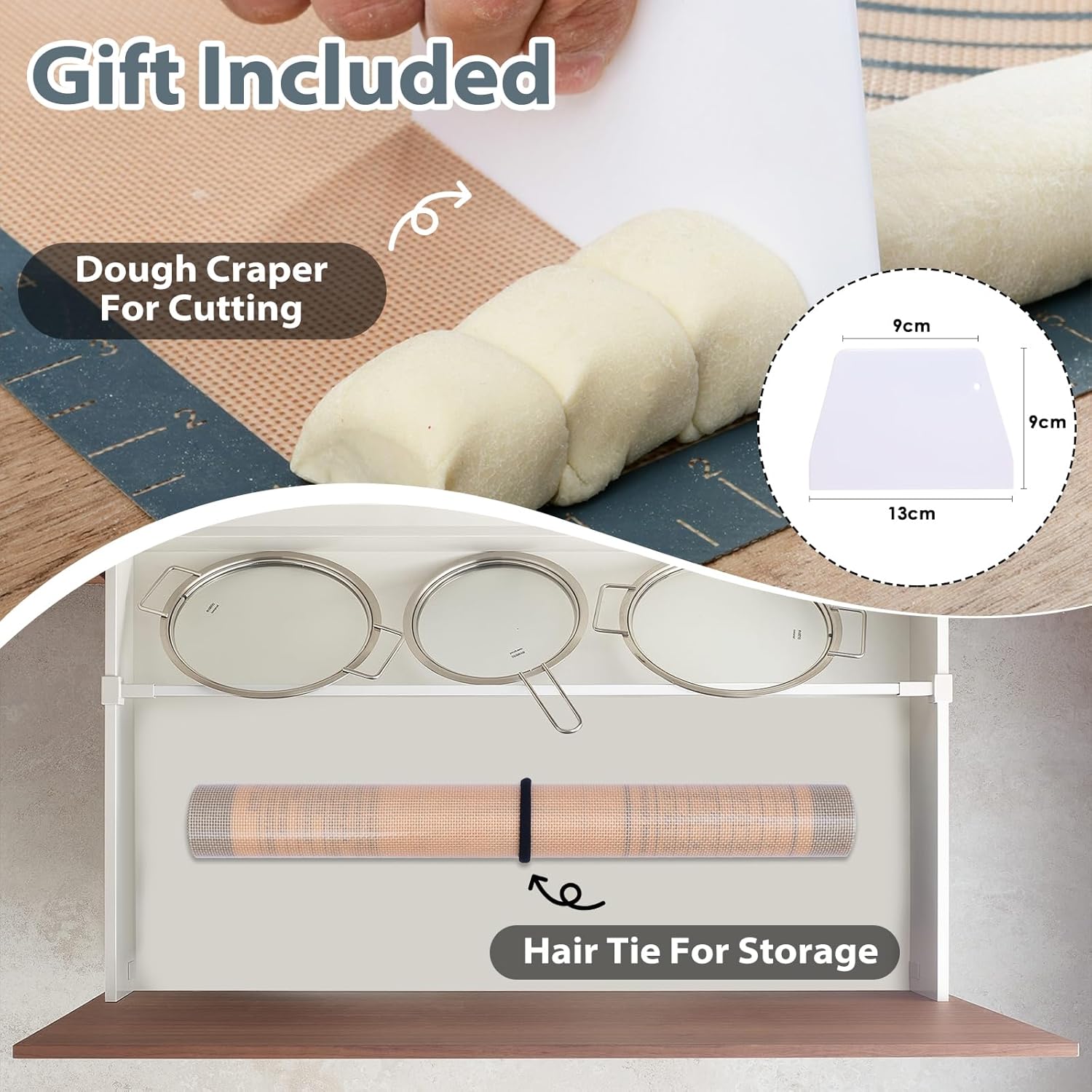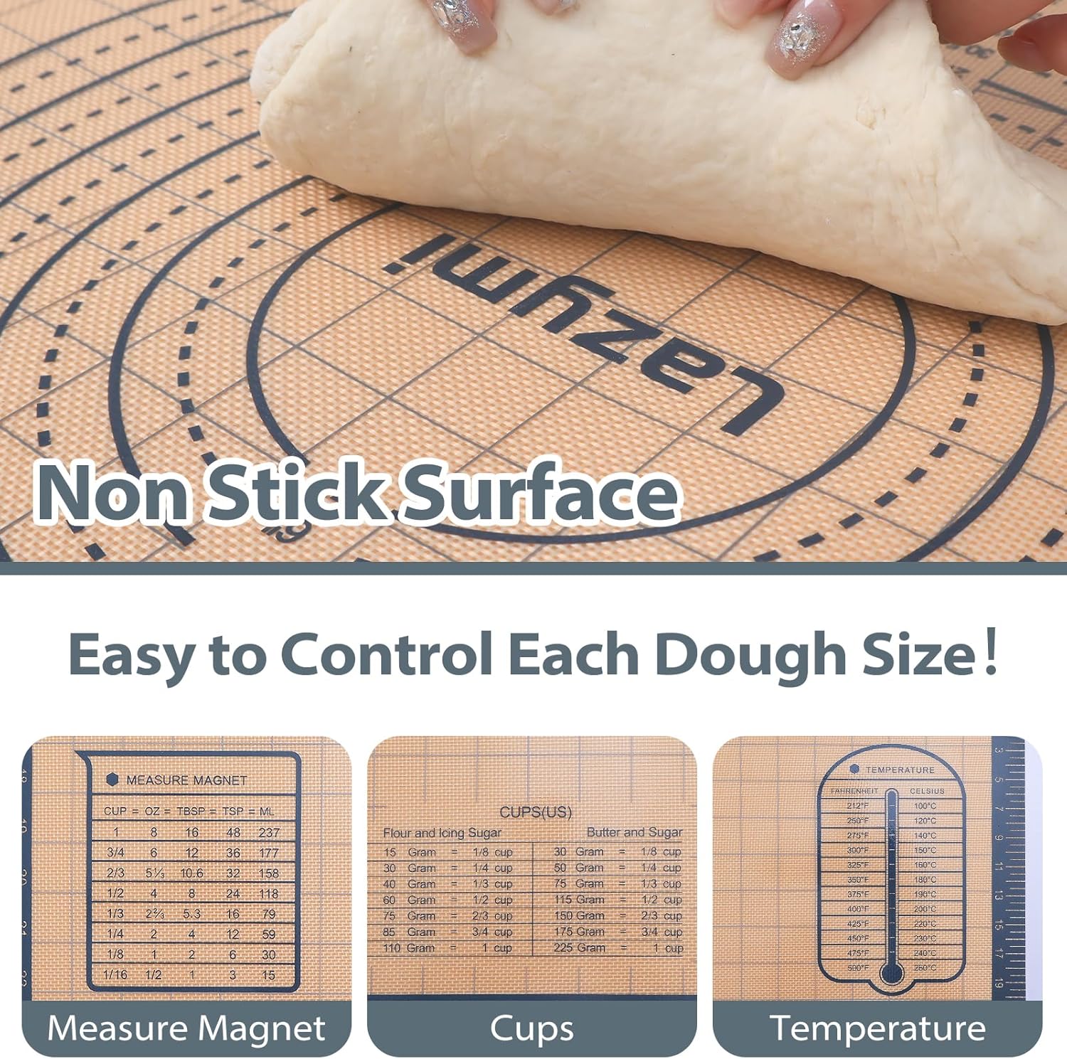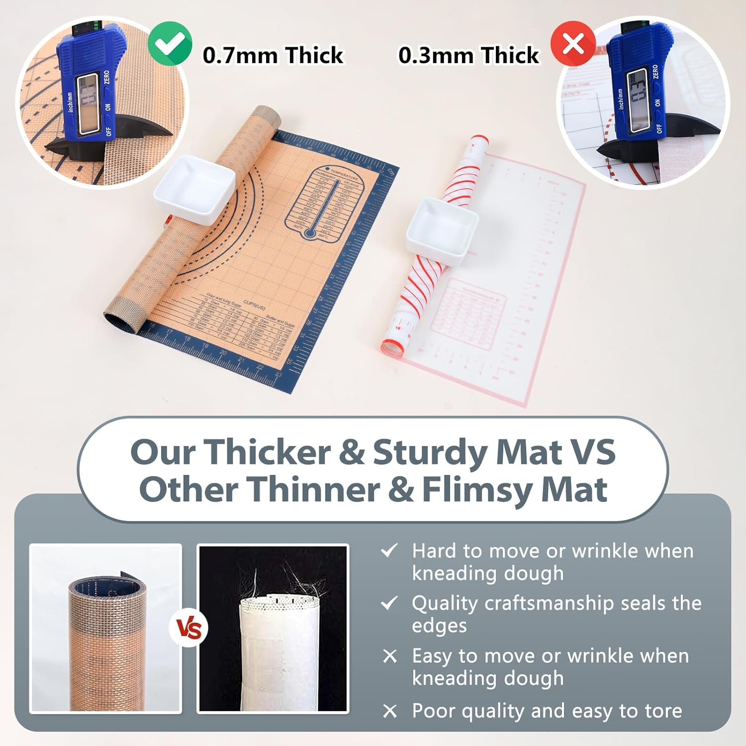 - đăDoppelte DickeăLazymi Silikon-Backmatten mit einer Dicke von 0,7 mm.Diese teigunterlage sind dicker als andere mit Glasfaser verstĂ€rkte teigmatte der gleichen Grösse.Dicker bedeutet haltbarer und hochwertiger. Diese ausrollmatte ist beim